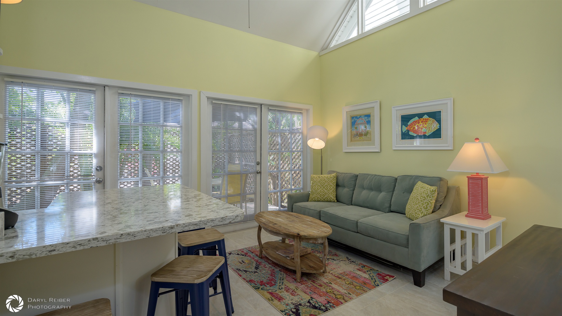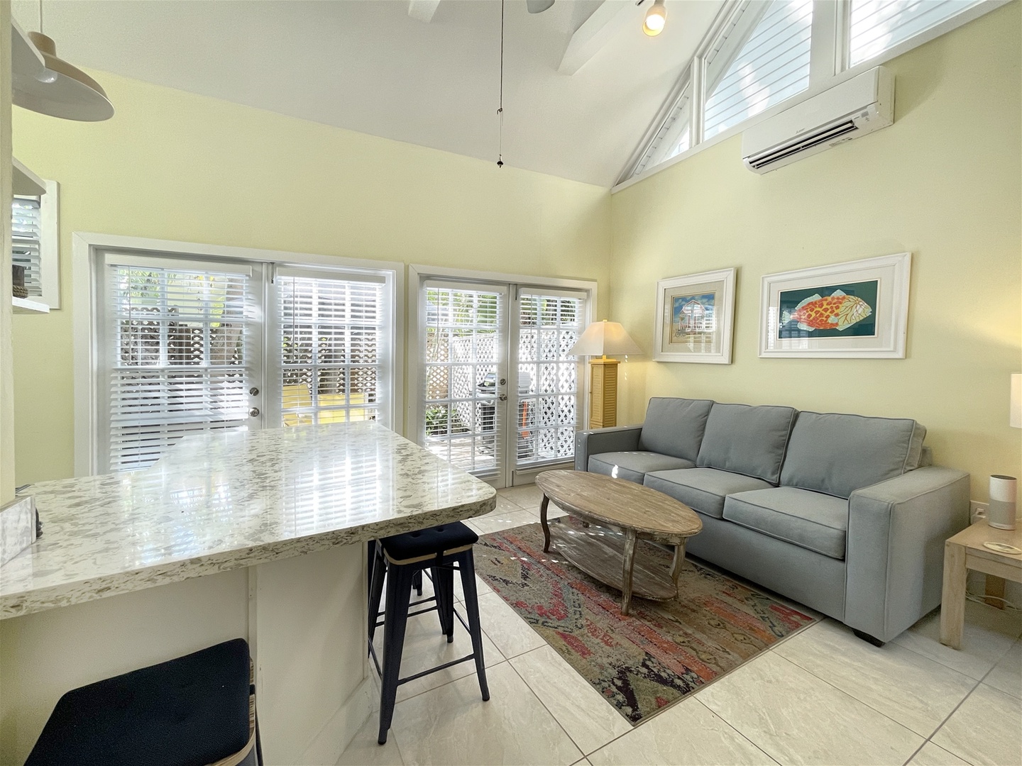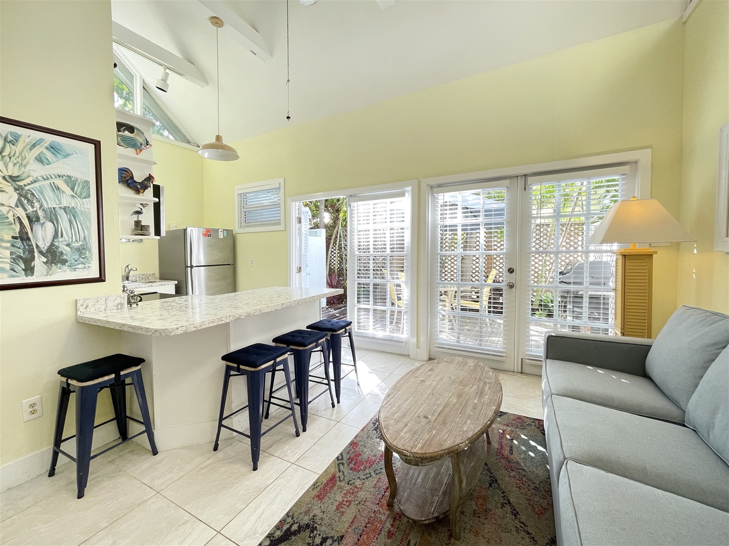Tucked among a colony of freestanding Conch style cottages and lush tropical landscaping sits the newly renovated Hidden Oasis. Features of this property include a private bedroom with king bed, full kitchen, a living room with queen sleeper sofa, cable TV, gas BBQ grill, shaded private deck with outdoor dining, and a shared poolside patio, all at a great nightly rate. This one-bedroom cottage is steps from the shared oasis-style, heated pool. It has been renovated with new floors and offers a kitchen with all new appliances. The kitchen has both a drip and a Keurig coffee maker. There is a washer and dryer in this rental and an outdoor shower on the private deck.