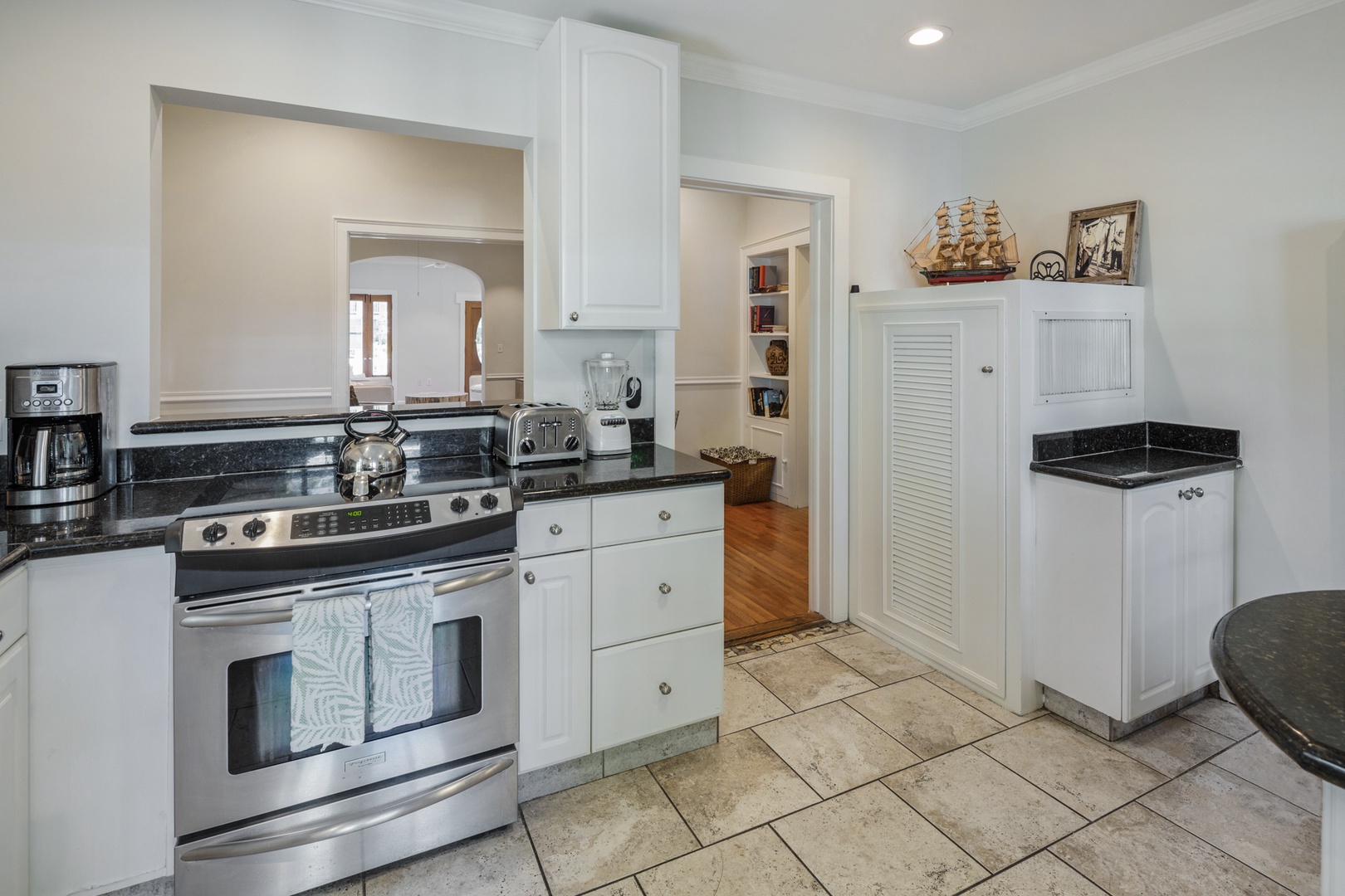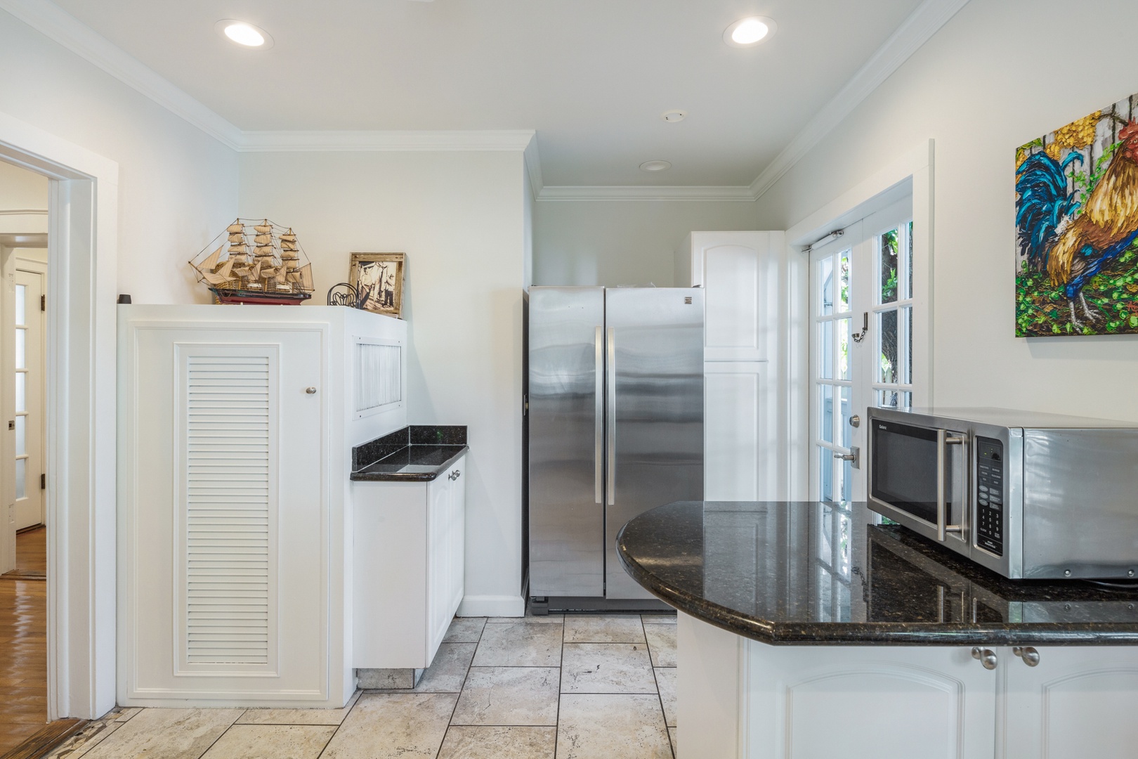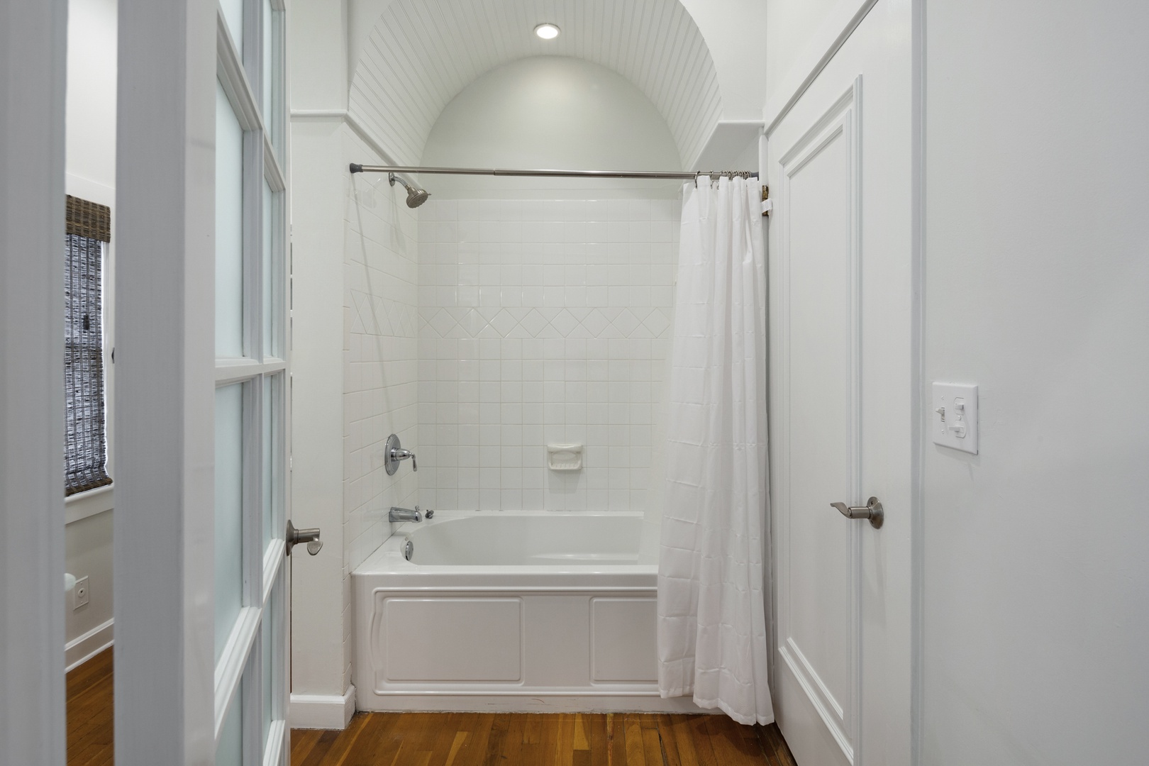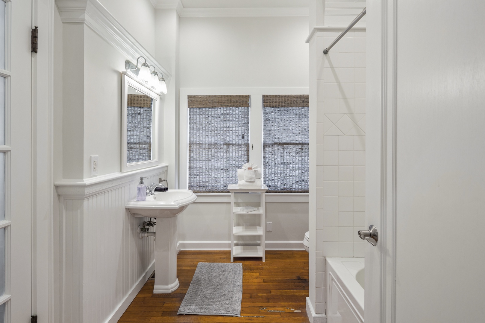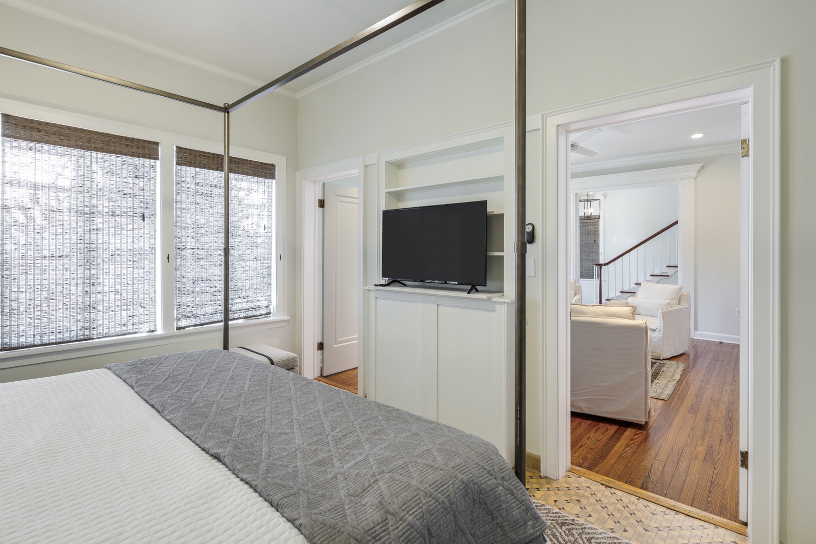 The New Orleans themed bedroom has a four poster queen bed. The bathroom is ensuite and has a tub/ shower combo with a dramatic high tiled archway above. The original solarium is home to a unique bedroom with Cuban tile floors and an ample king bed. The bathroom is nearby and has a tiled walk-in shower.