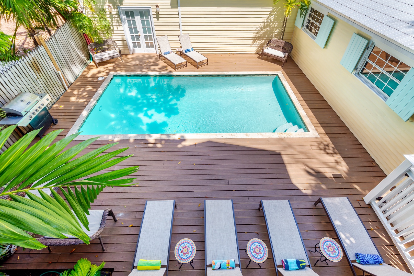 The third floor offers a unique, private, split-level suite with its own media area, small kitchen, bedroom with a king bed, and a full bathroom. The suite has beautiful hardwood floors and offers a private balcony with a view of the pool area. The bathroom’s two skylights are a unique feature bringing in the natural light and one is actually above the walk-in tiled shower. A bonus privacy and safety feature of this house is an exterior back staircase to the second and third floors.