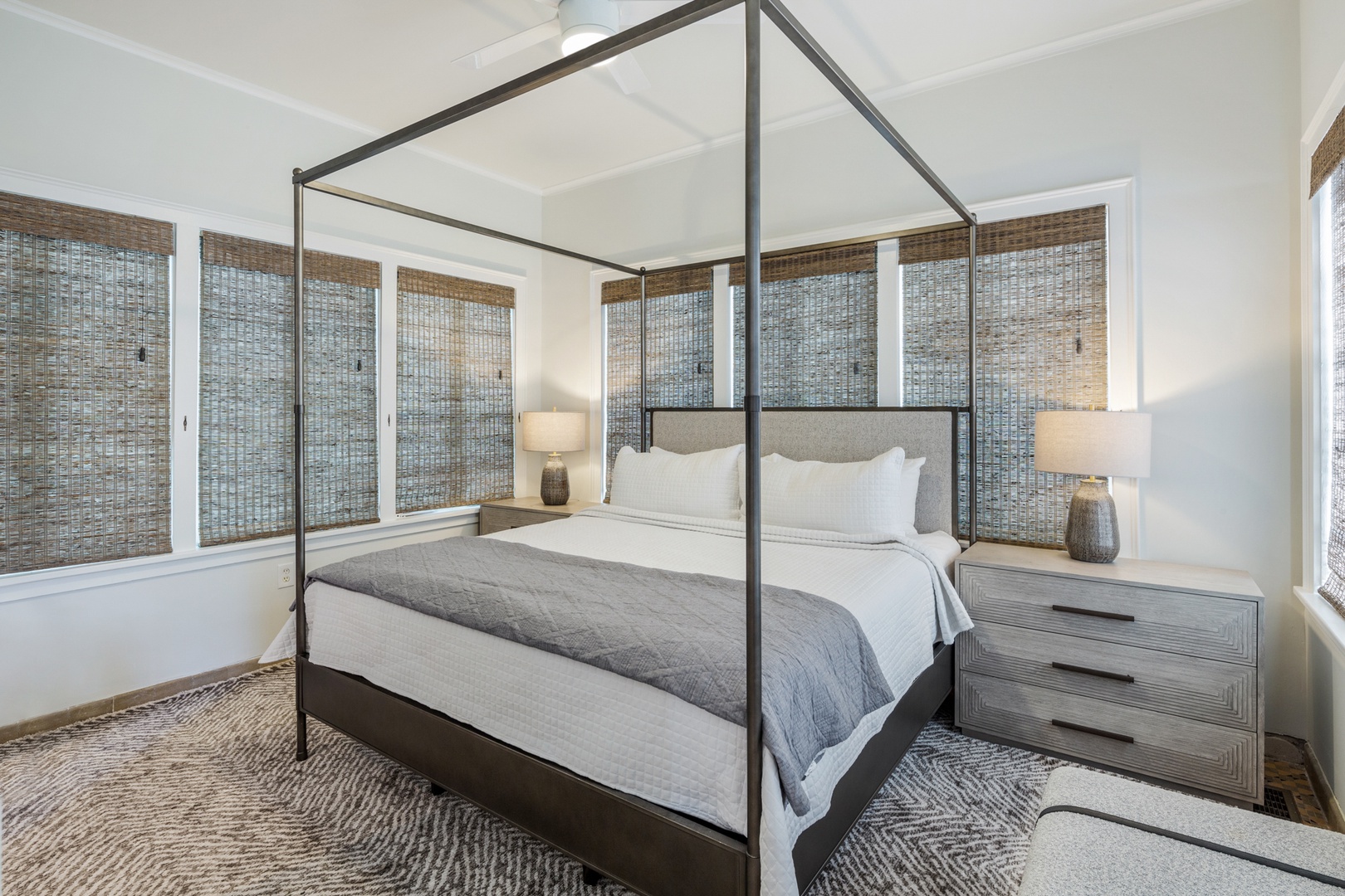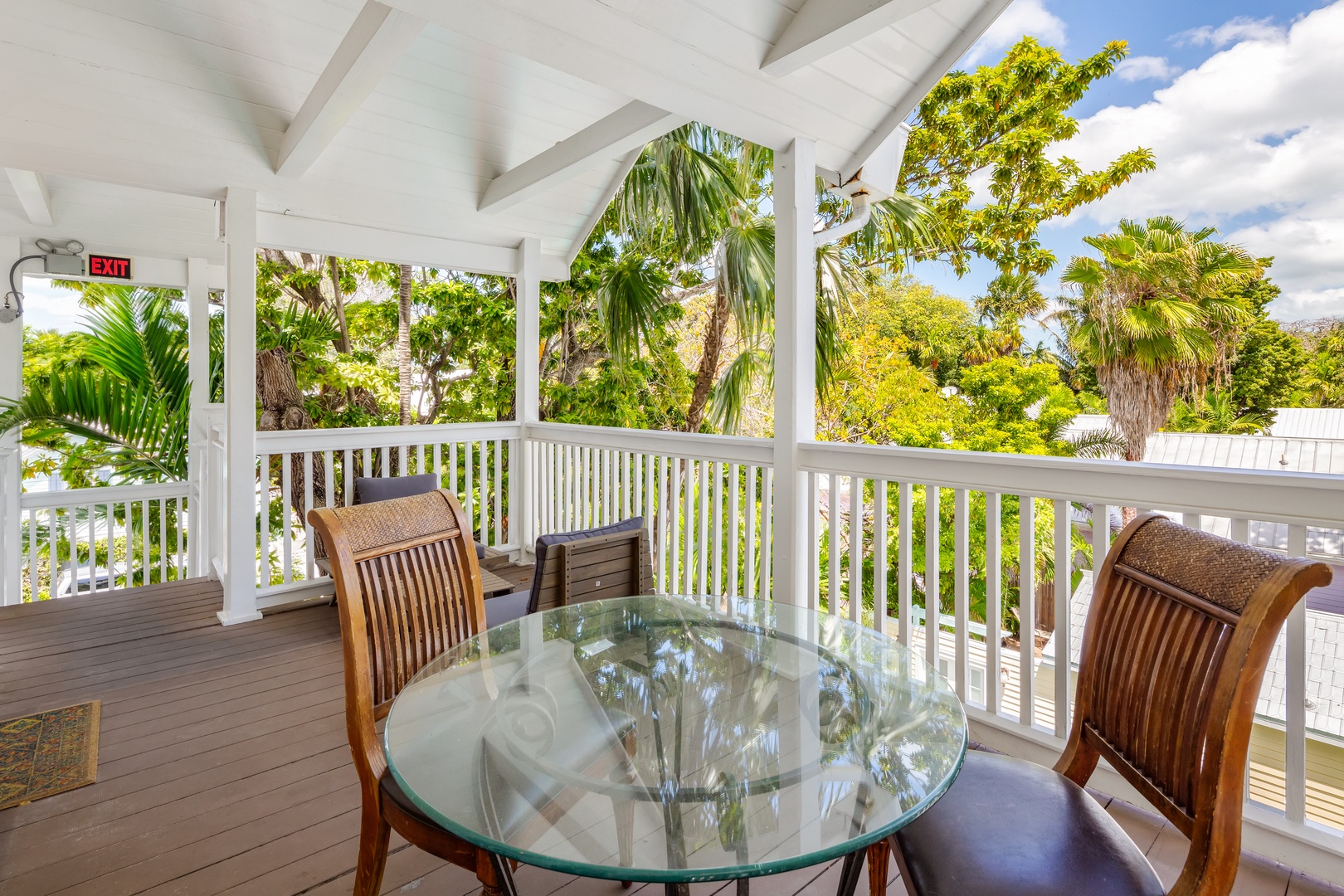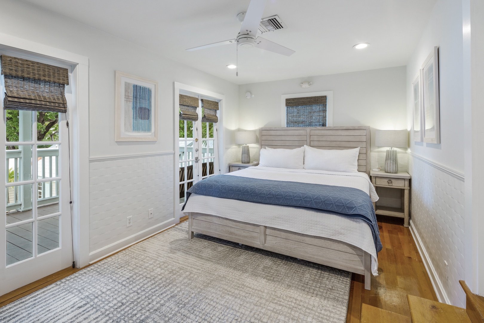 The banister from the 1890’s and beautiful chandelier guide you up the staircase to the 4 bedrooms and 4 bathrooms on the 2nd floor. The front bedroom has a queen bed and French doors leading to the balcony that spans the width of the house and offers a view of the historic streetscape below. The ensuite bathroom is finished in tile and has a walk-in shower. The west bedroom offers a pencil-style four poster queen bed. The room has original Dade County Pine wood planked floors and large windows. The bathroom is ensuite with a tiled walk-in shower. The east bedroom contains a king bed and features island style wicker furnishings. The ensuite bathroom has a tiled walk-in shower. The back bedroom has a modern aesthetic with a king bed and two sets of French doors leading to the balcony overlooking the outdoor living space and pool. The ensuite bathroom has double sinks and a tiled walk-in shower.