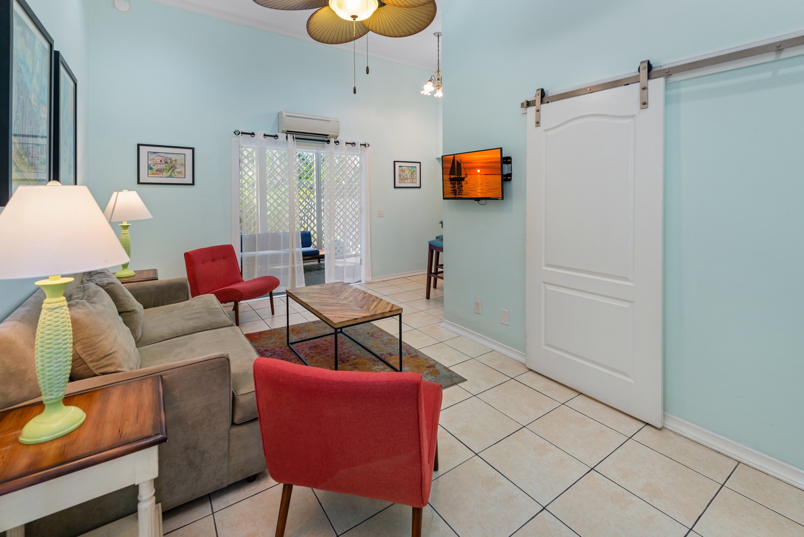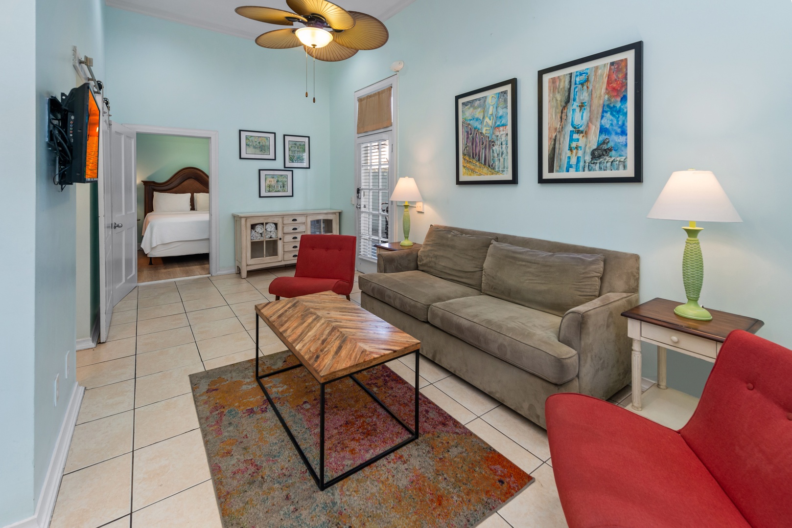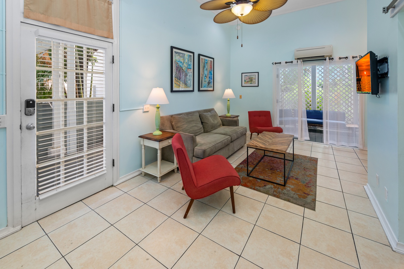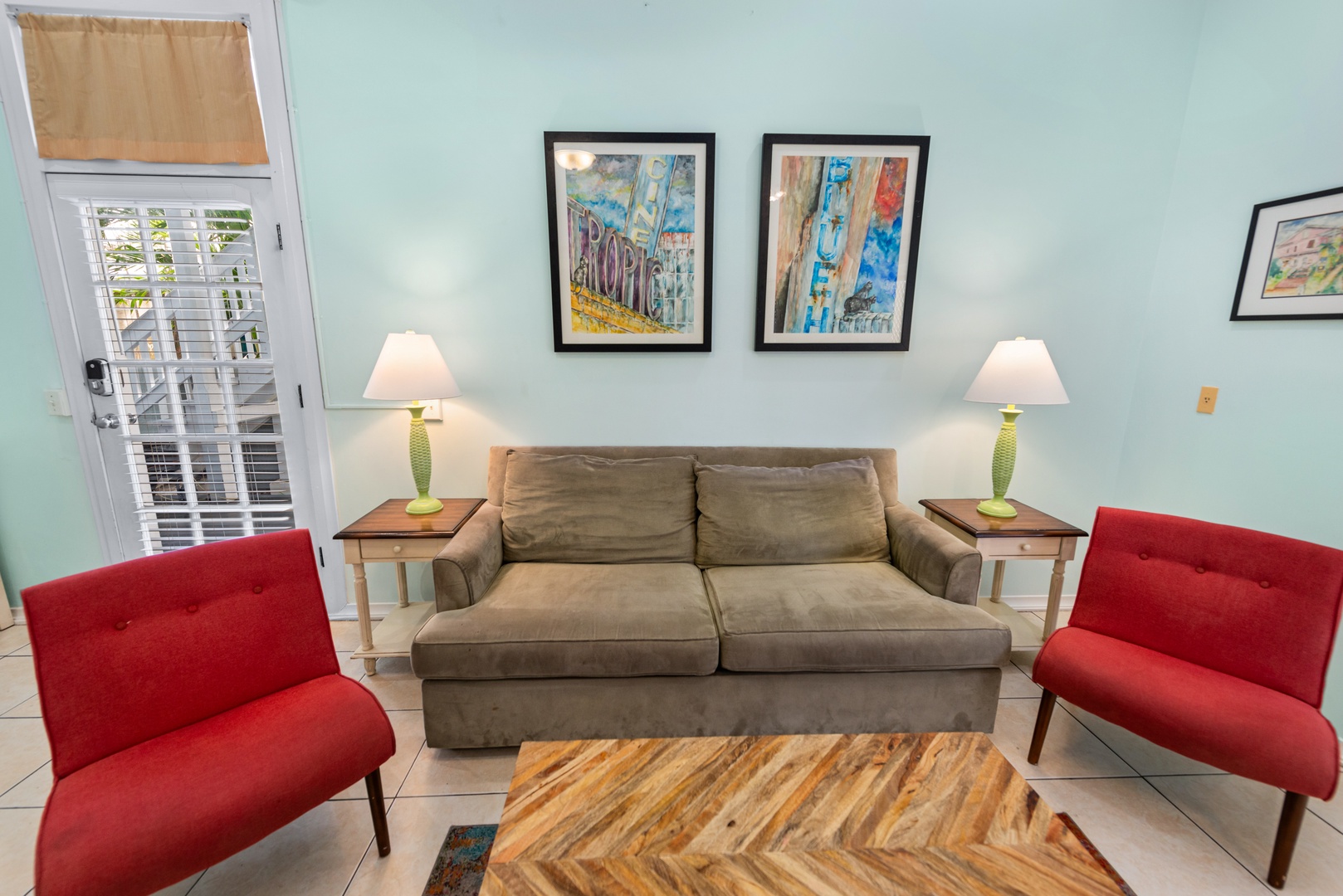 This spacious ground-level two-bedroom, two-bathroom property is located in the heart of Key West right off of Duval Street. A private, enclosed patio beckons you to relax in peaceful seclusion. The primary bedroom features a king-sized bed and a 32\" flat-screen TV. The second bedroom has a queen bed. The living room area has as well as another 32\" flat-screen TV. The kitchen features a full-sized refrigerator, oven, toaster, microwave, and coffee maker to do all or none of the cooking while enjoying the island life. This property comes equipped with a private porch, air conditioning, free wi-fi, and an in-unit washer/dryer.