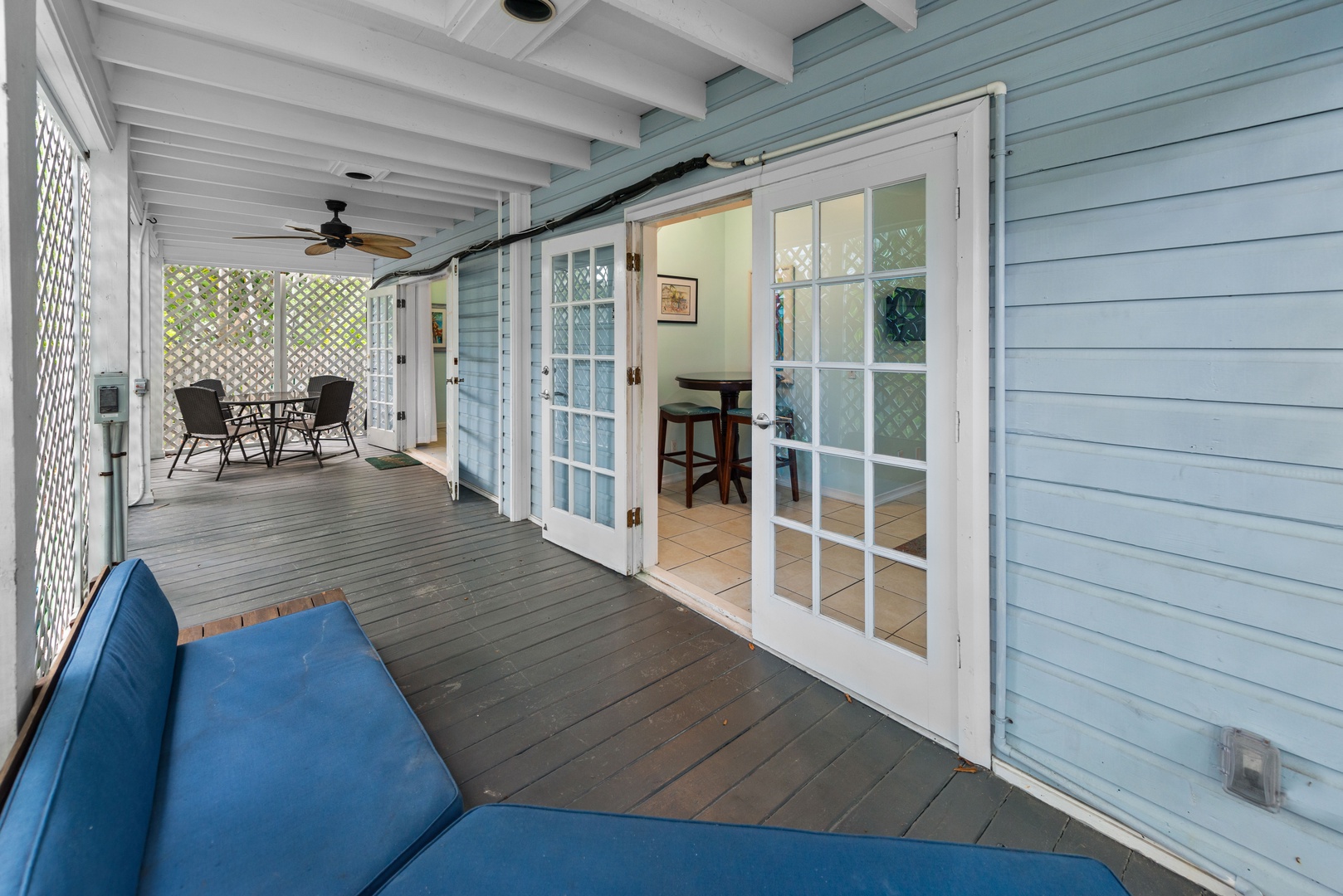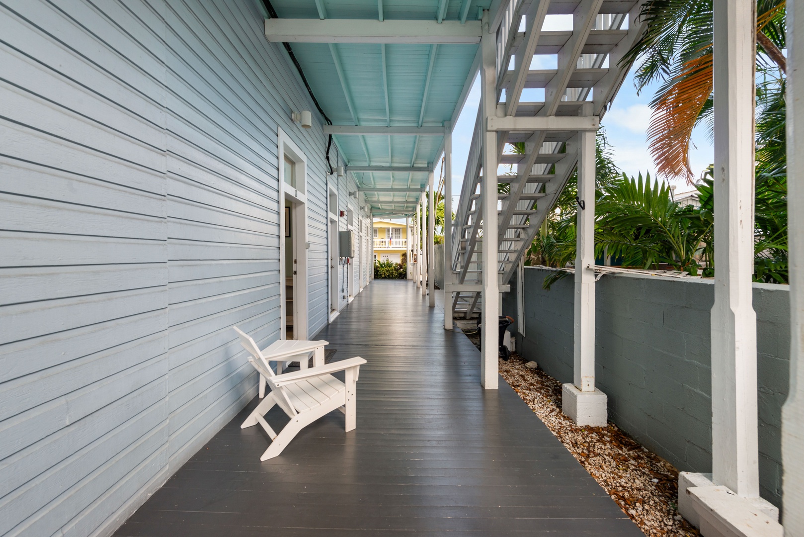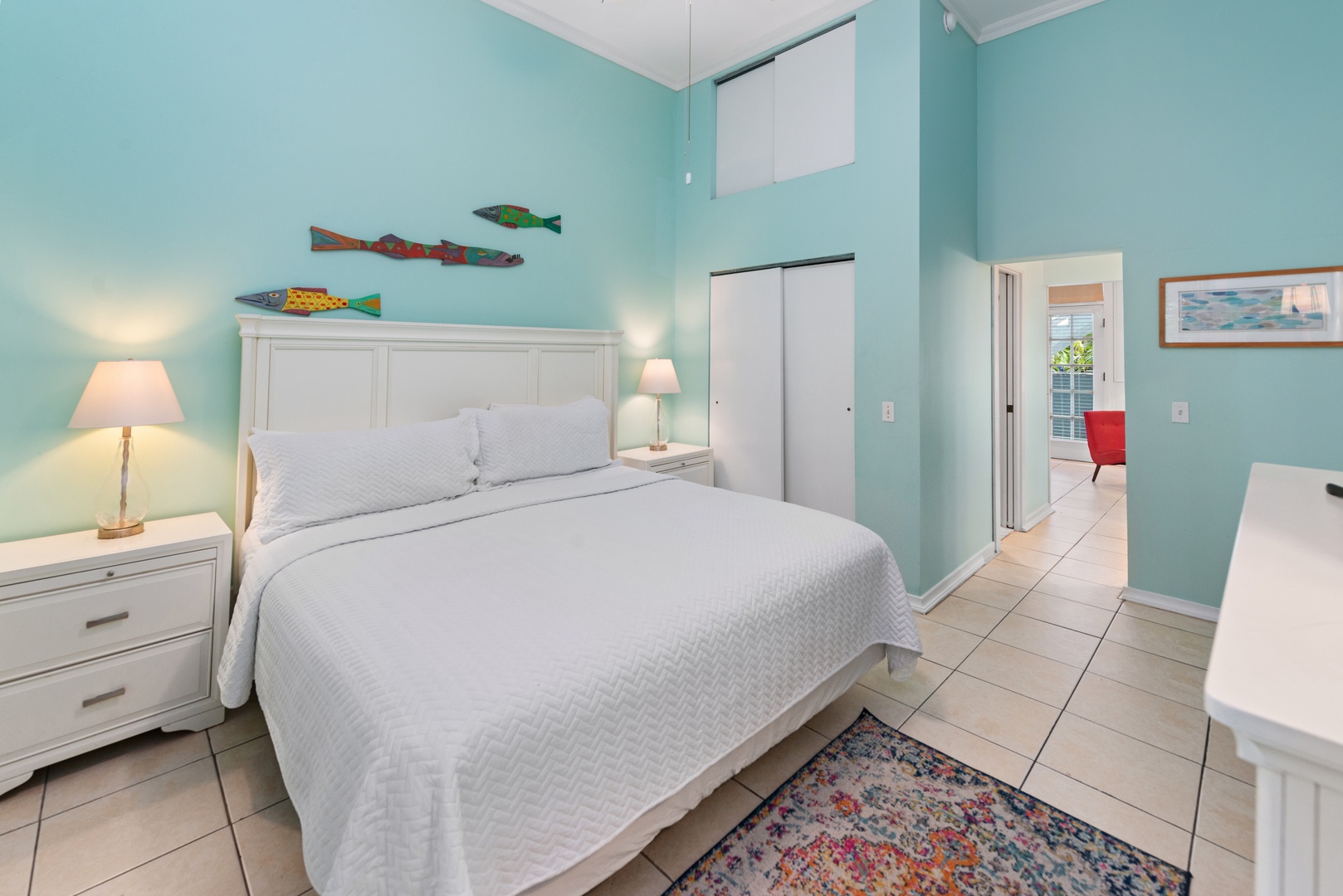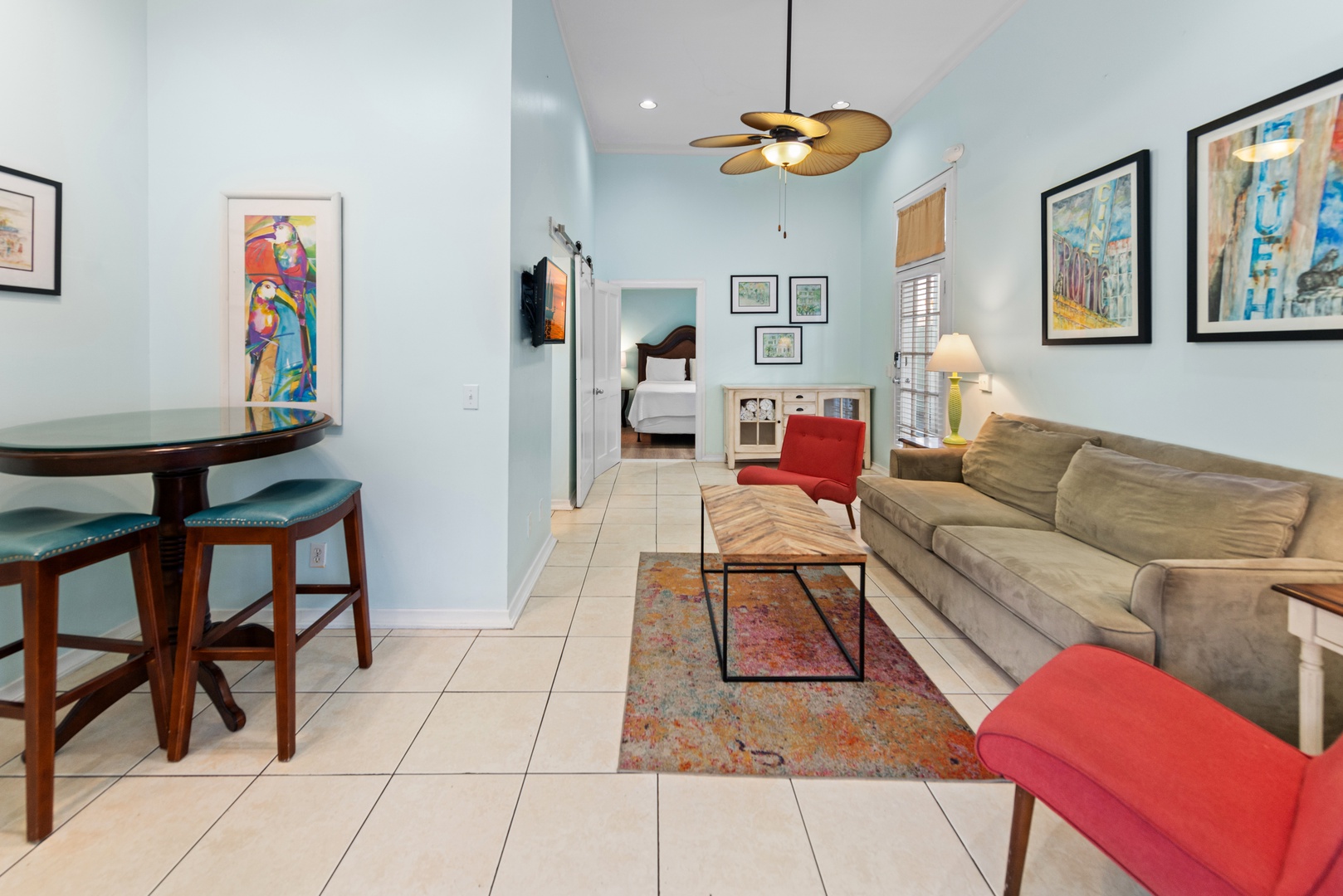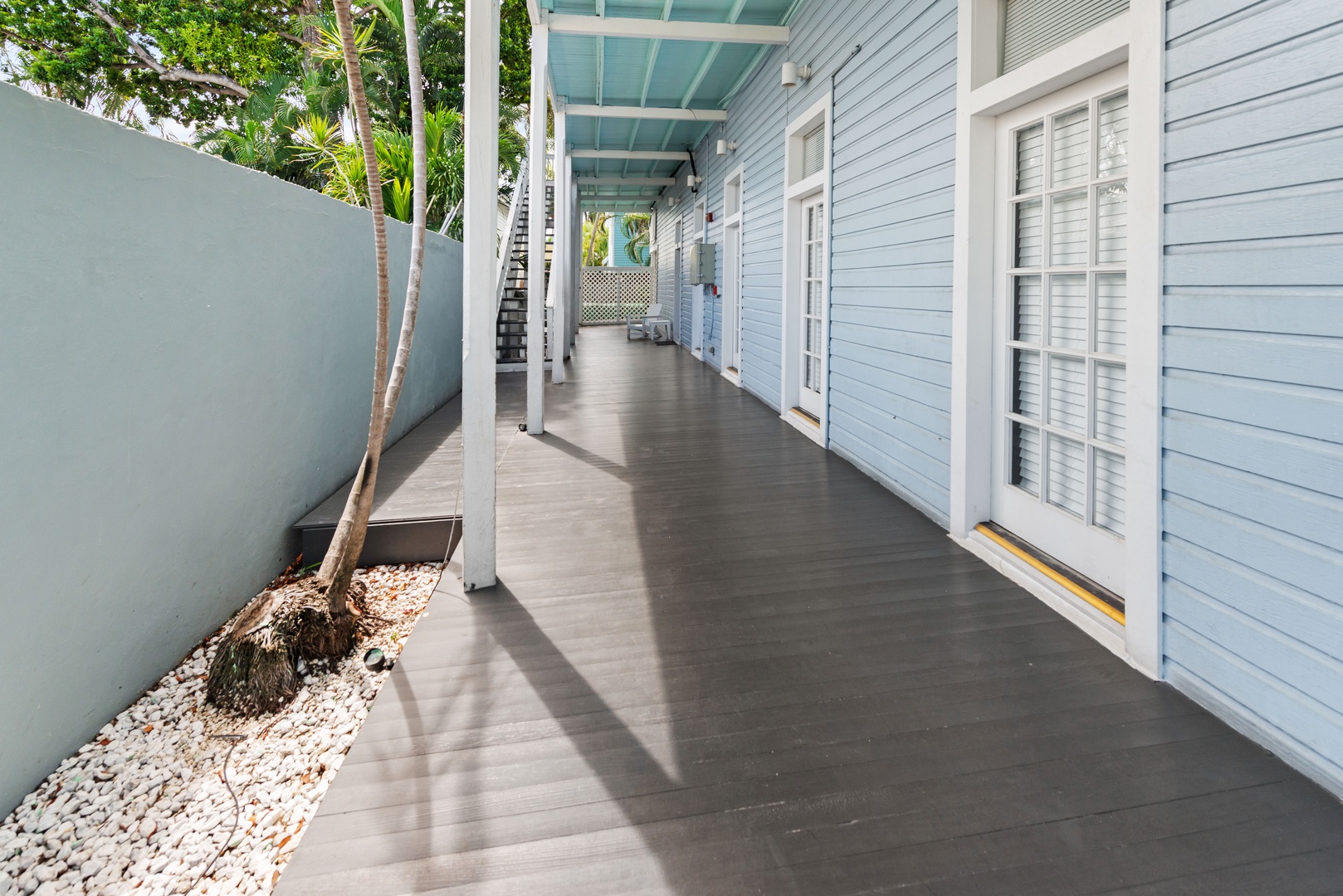 This spacious ground-level two-bedroom, two-bathroom property is located in the heart of Key West right off of Duval Street. A private, enclosed patio beckons you to relax in peaceful seclusion. The primary bedroom features a king-sized bed and a 32\" flat-screen TV. The second bedroom has a queen bed. The living room area has as well as another 32\" flat-screen TV. The kitchen features a full-sized refrigerator, oven, toaster, microwave, and coffee maker to do all or none of the cooking while enjoying the island life. This property comes equipped with a private porch, air conditioning, free wi-fi, and an in-unit washer/dryer.