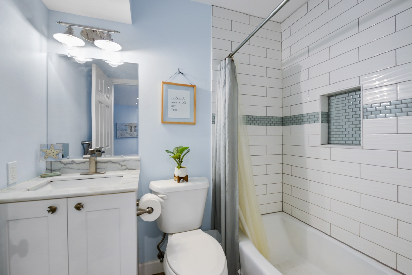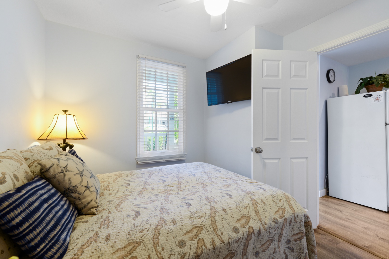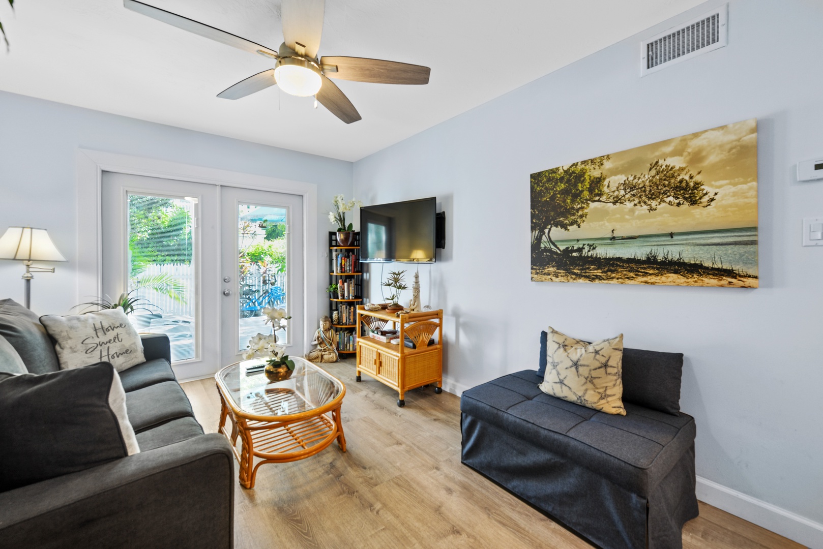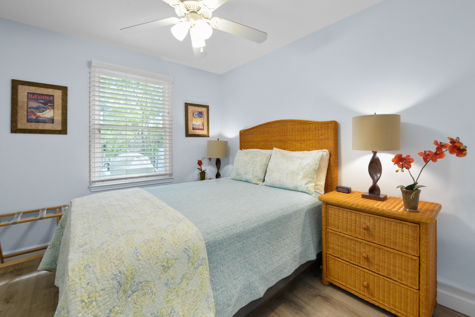 Tiki Beach Too has two bedrooms with 1 King and Queen size beds. Each bedroom is set to be an oasis of tranquility, featuring plush bedding and soothing decor to ensure a restful night\'s sleep after a day of exploring Key West. The bathroom off the common space has a tub, while a full bath with shower is ensuite of the front bedroom. Both bathrooms are elegantly designed, offering modern amenities and a spa-like atmosphere.