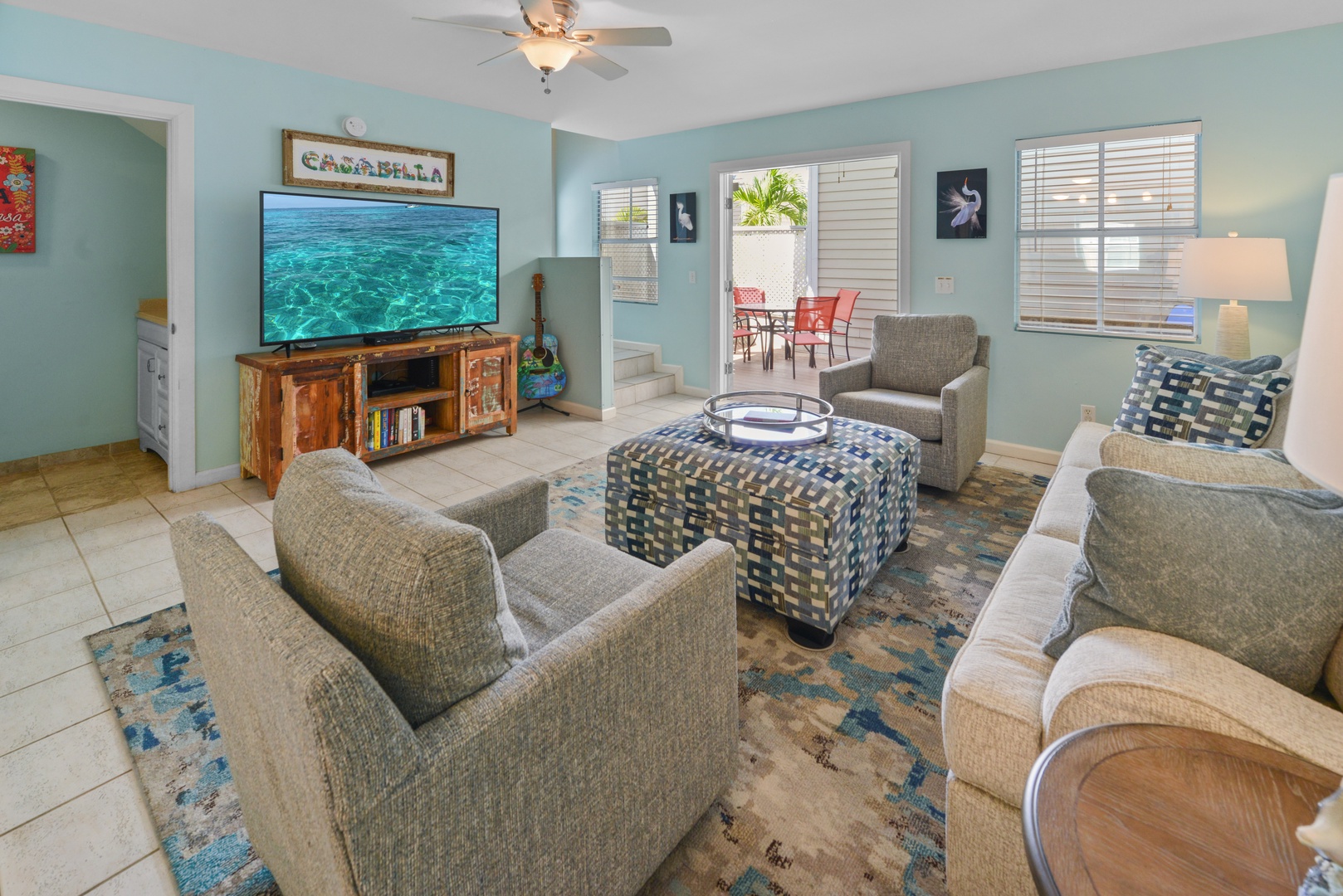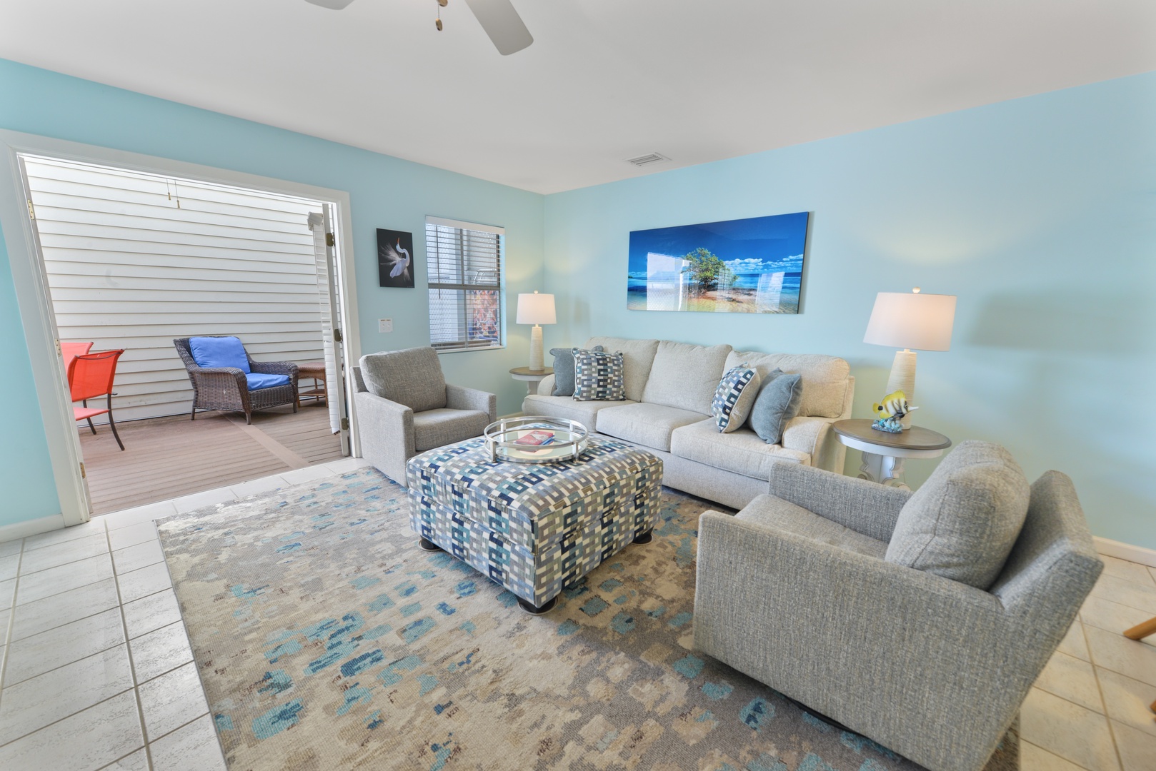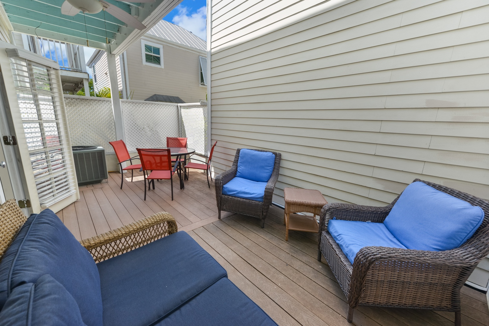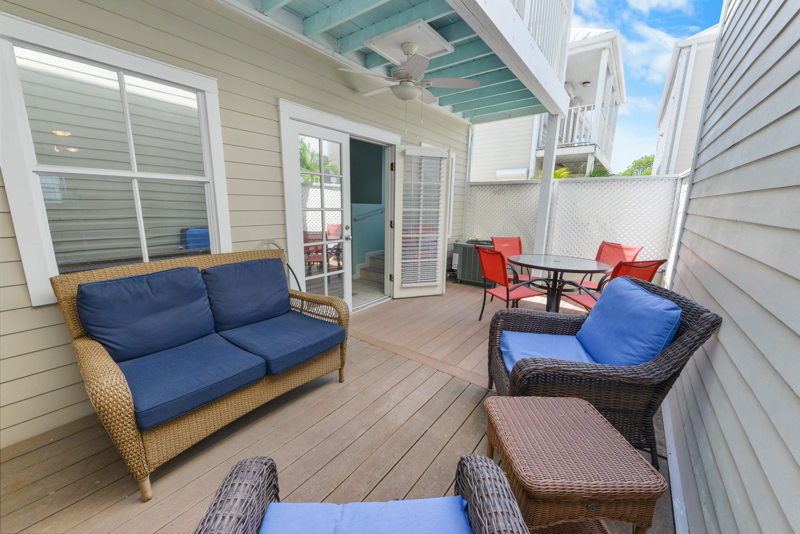 When you enter the home you will find a fully equipped kitchen, dining area, spacious living room and a convenient half bath. French doors let in the natural sunshine and open to the private back deck with dining table and chairs perfect for outdoor entertaining.