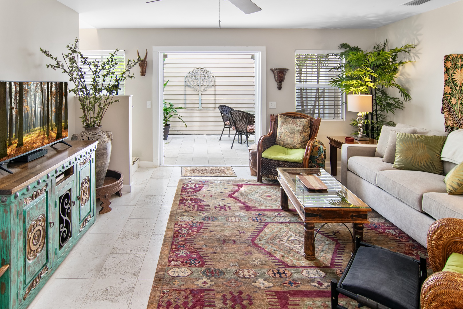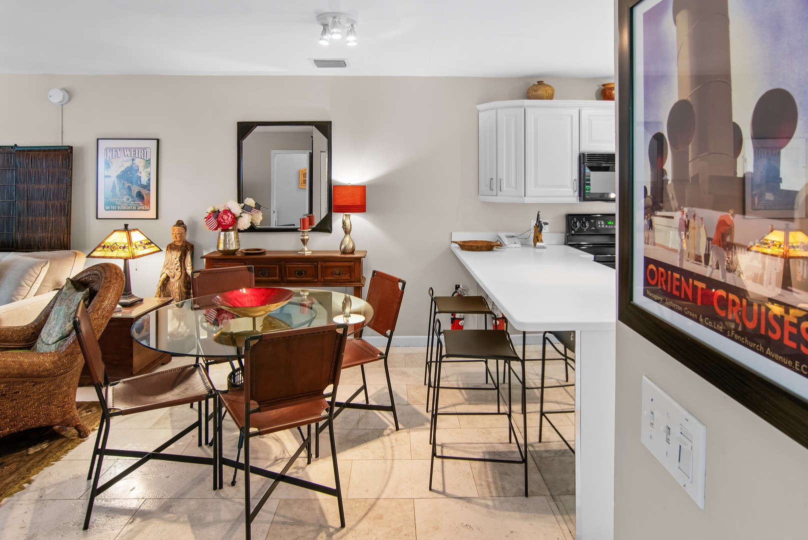 Duval Square Retreat is In the heart of Old Town. Duval Square is located at the \"artistic\" and quieter end of Duval Street. This recently upgraded unit is tastefully decorated with design elements from around the world. The first floor offers a well- equipped kitchen, and an open living and dining concept, French doors to a private balcony and a half bath powder room.