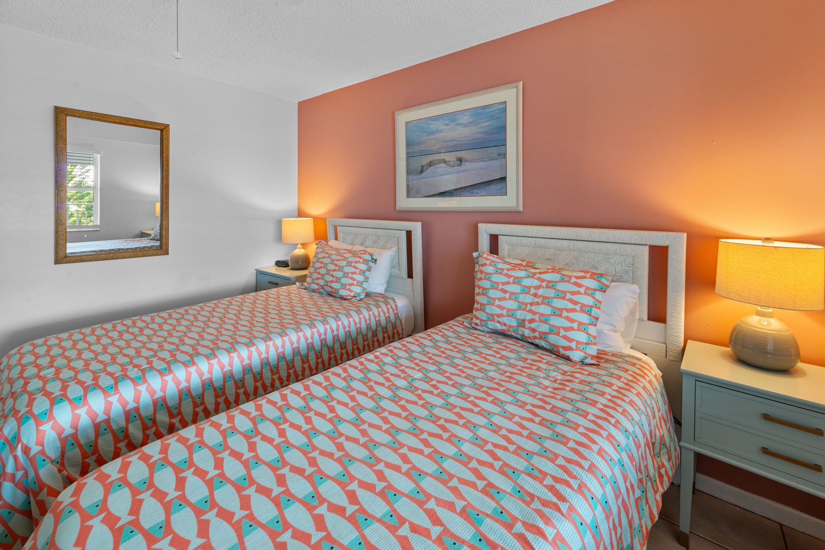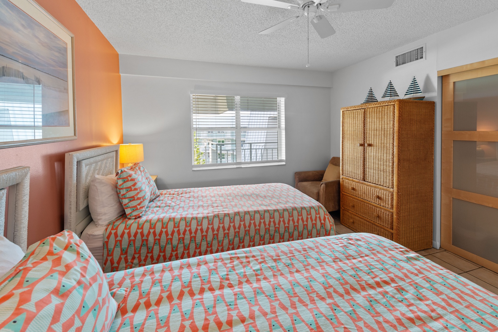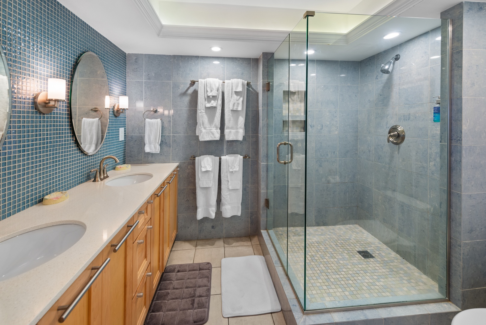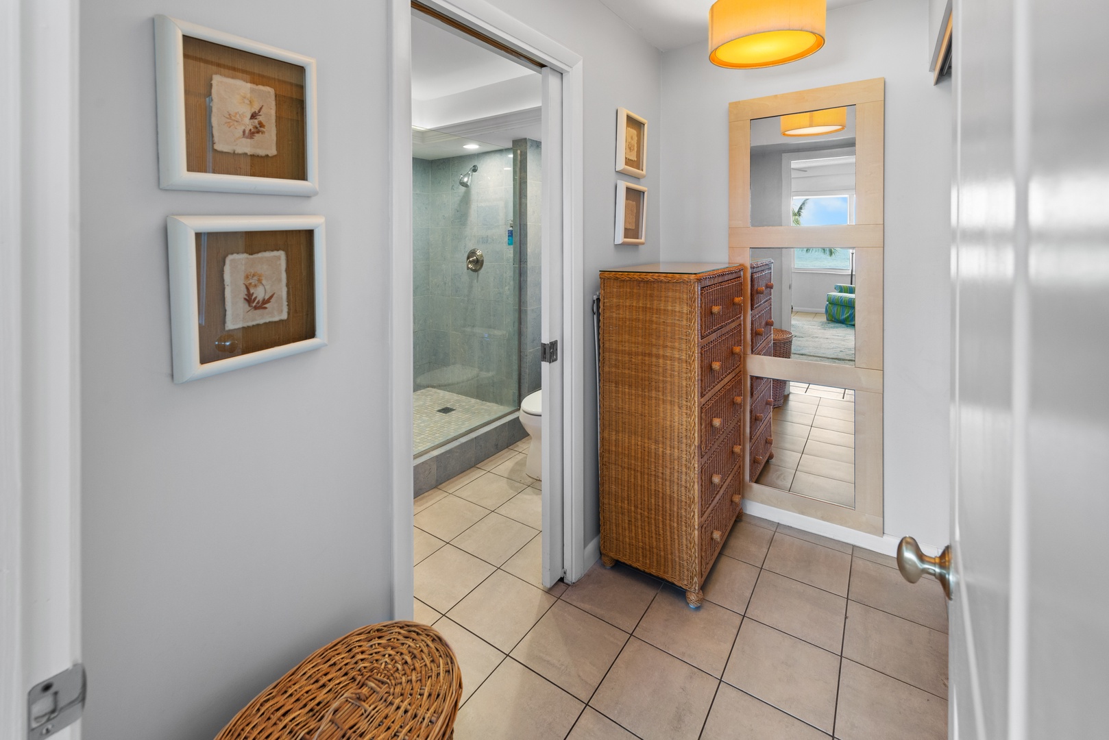 The primary bedroom offers a king bed and double windows looking out over the ocean and a fabulous walk in closet/dressing room. The spa-like primary bathroom has dual vanities and an oversized, glass-enclosed walk-in shower. This bedroom also has its own individual access to the private balcony, perfect for an early morning cup of coffee and a sunrise. The second bedroom has two twin beds and a large closet boasting lots of storage. The second bathroom is stylish with its modern glass and tile shower, full wall mirror and granite topped vanity.