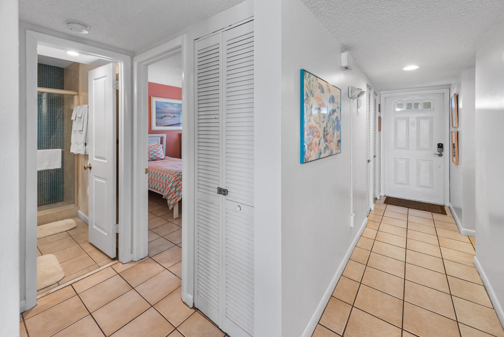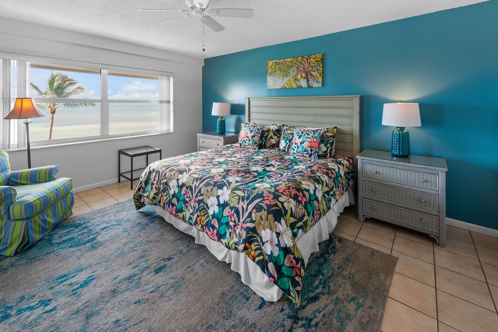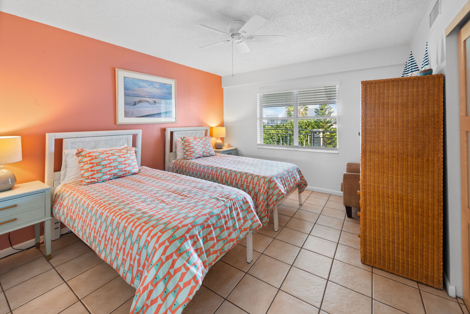 The primary bedroom offers a king bed and double windows looking out over the ocean and a fabulous walk in closet/dressing room. The spa-like primary bathroom has dual vanities and an oversized, glass-enclosed walk-in shower. This bedroom also has its own individual access to the private balcony, perfect for an early morning cup of coffee and a sunrise. The second bedroom has two twin beds and a large closet boasting lots of storage. The second bathroom is stylish with its modern glass and tile shower, full wall mirror and granite topped vanity.