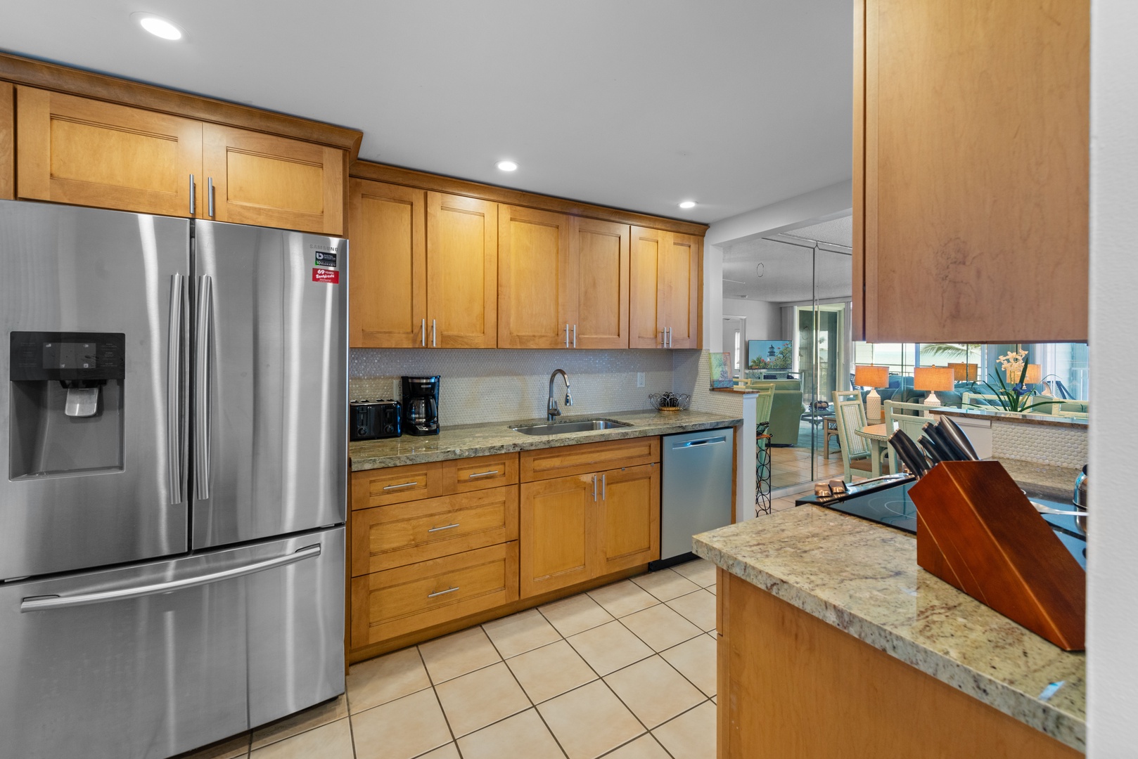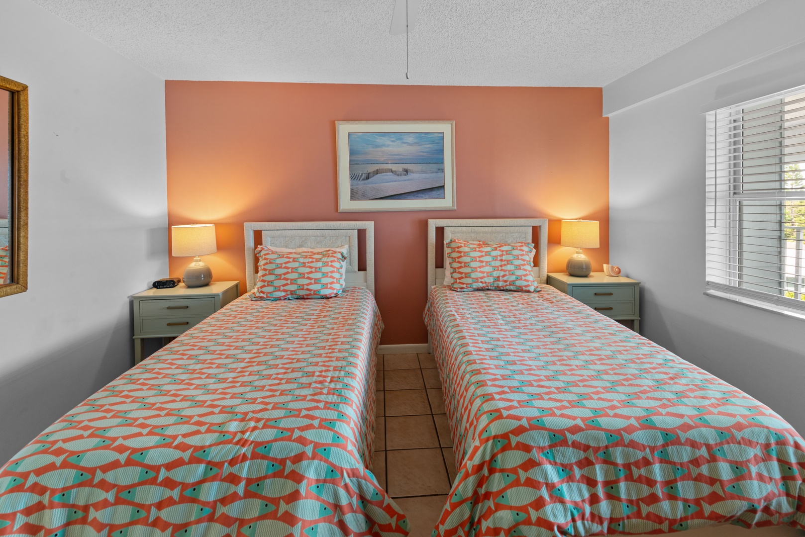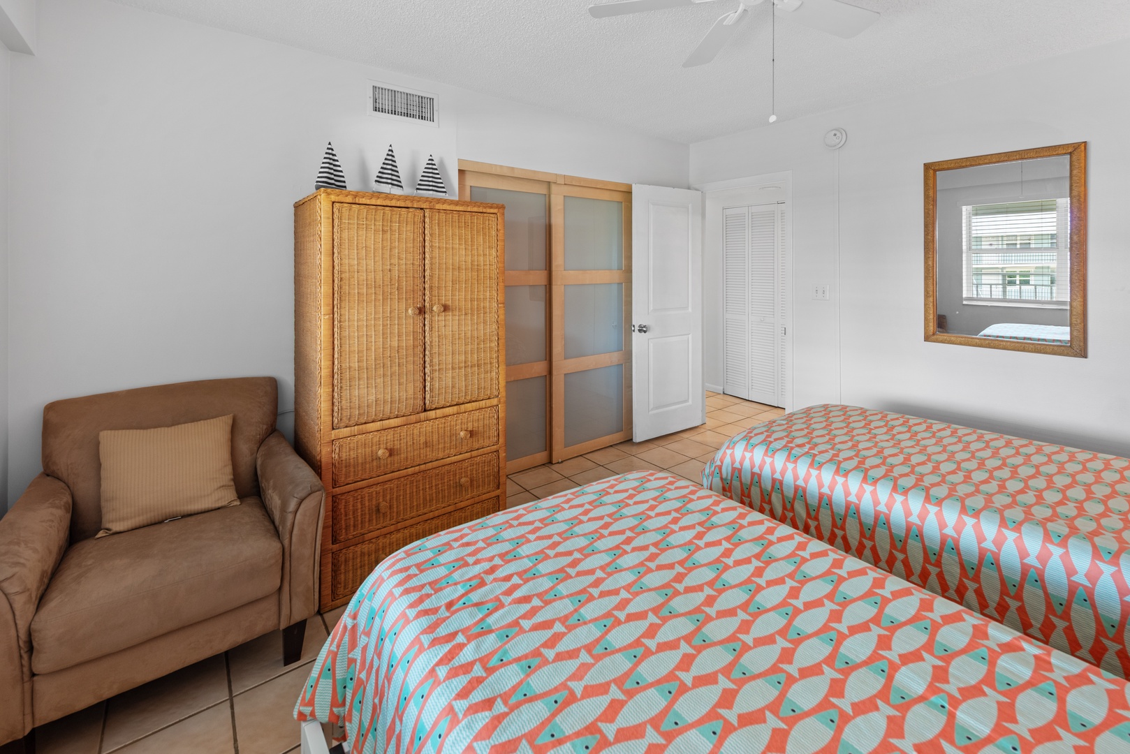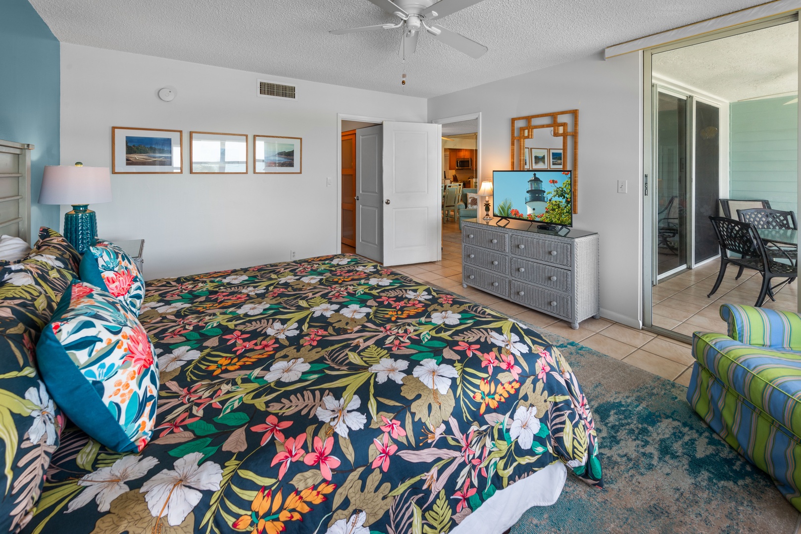 The primary bedroom offers a king bed and double windows looking out over the ocean and a fabulous walk in closet/dressing room. The spa-like primary bathroom has dual vanities and an oversized, glass-enclosed walk-in shower. This bedroom also has its own individual access to the private balcony, perfect for an early morning cup of coffee and a sunrise. The second bedroom has two twin beds and a large closet boasting lots of storage. The second bathroom is stylish with its modern glass and tile shower, full wall mirror and granite topped vanity.