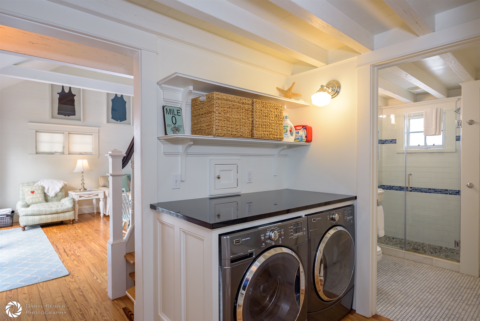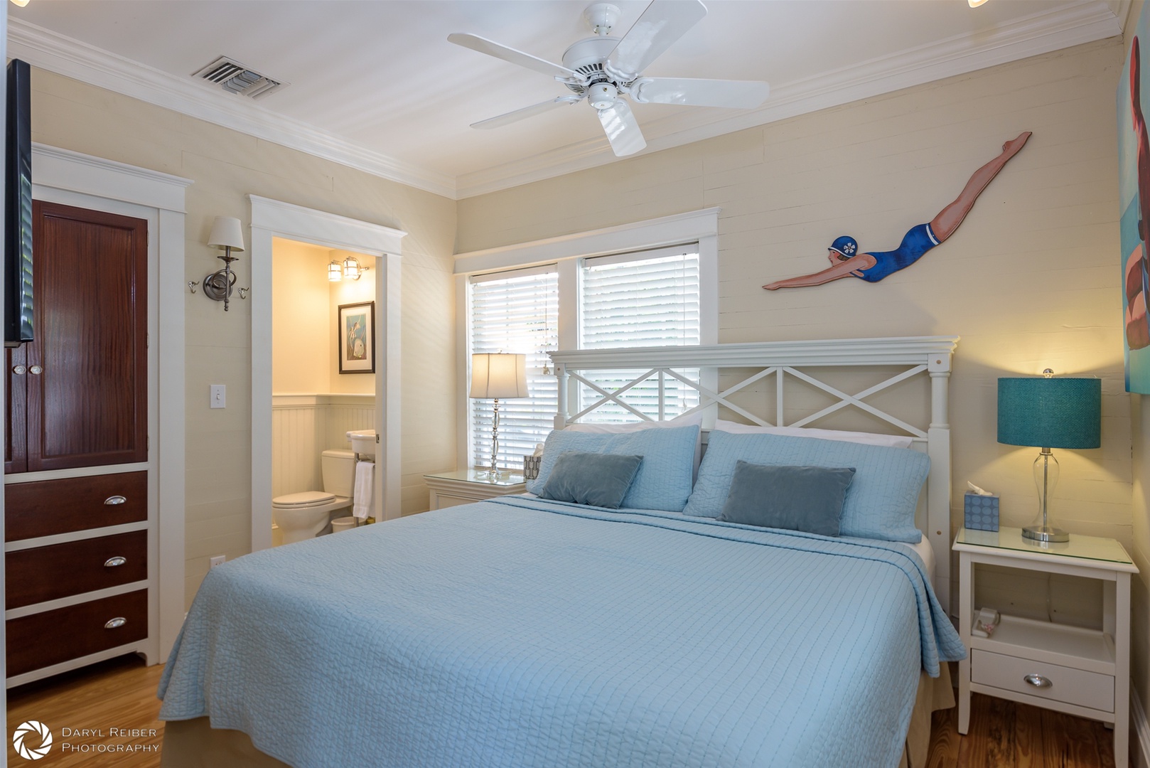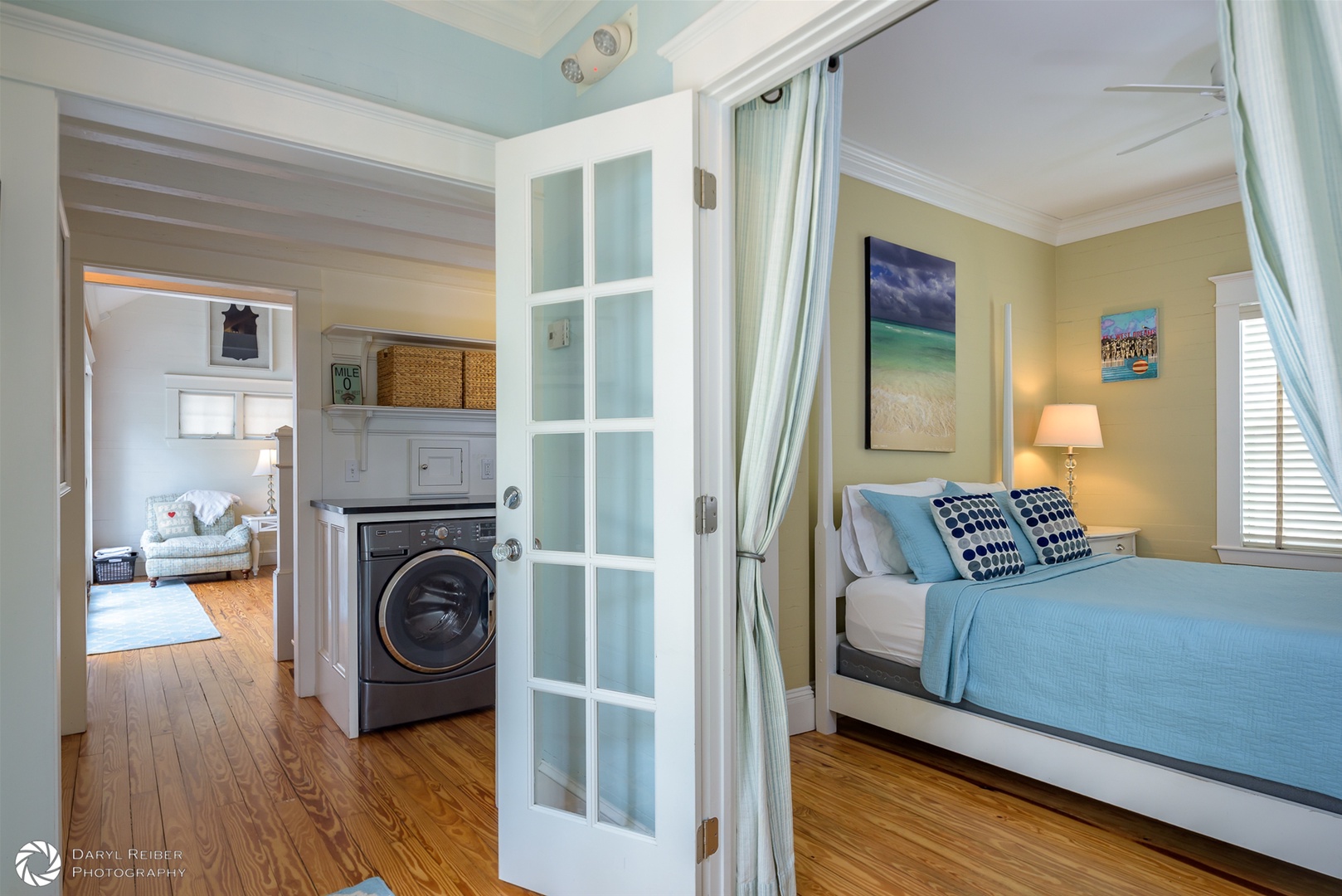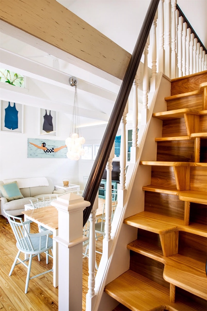 There is custom high-end wood cabinetry featured throughout the home. The kitchen has painted white maple cabinets with glass doors. The bedrooms and primary bath contain beautiful mahogany built-in cabinets, lending a Caribbean feel to the cottage. Stylish furnishings and artwork add to the tropical feel of the home, including a wonderful collection of antique swimsuits in custom shadow boxes.