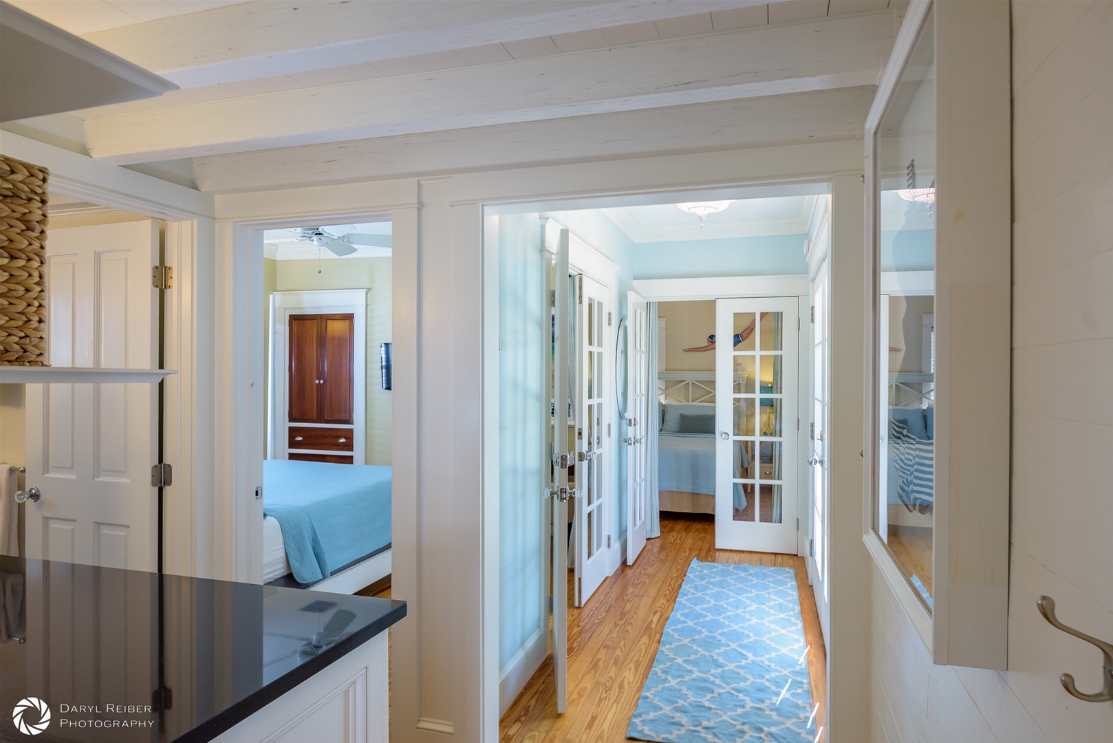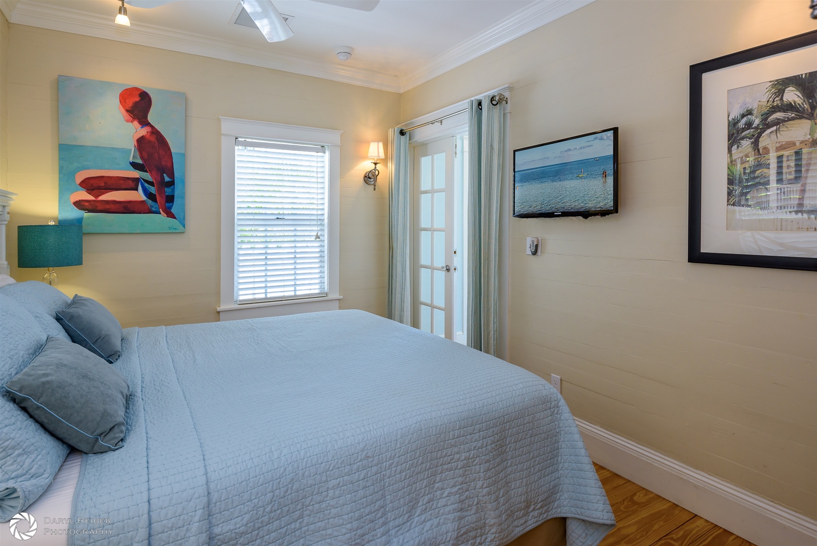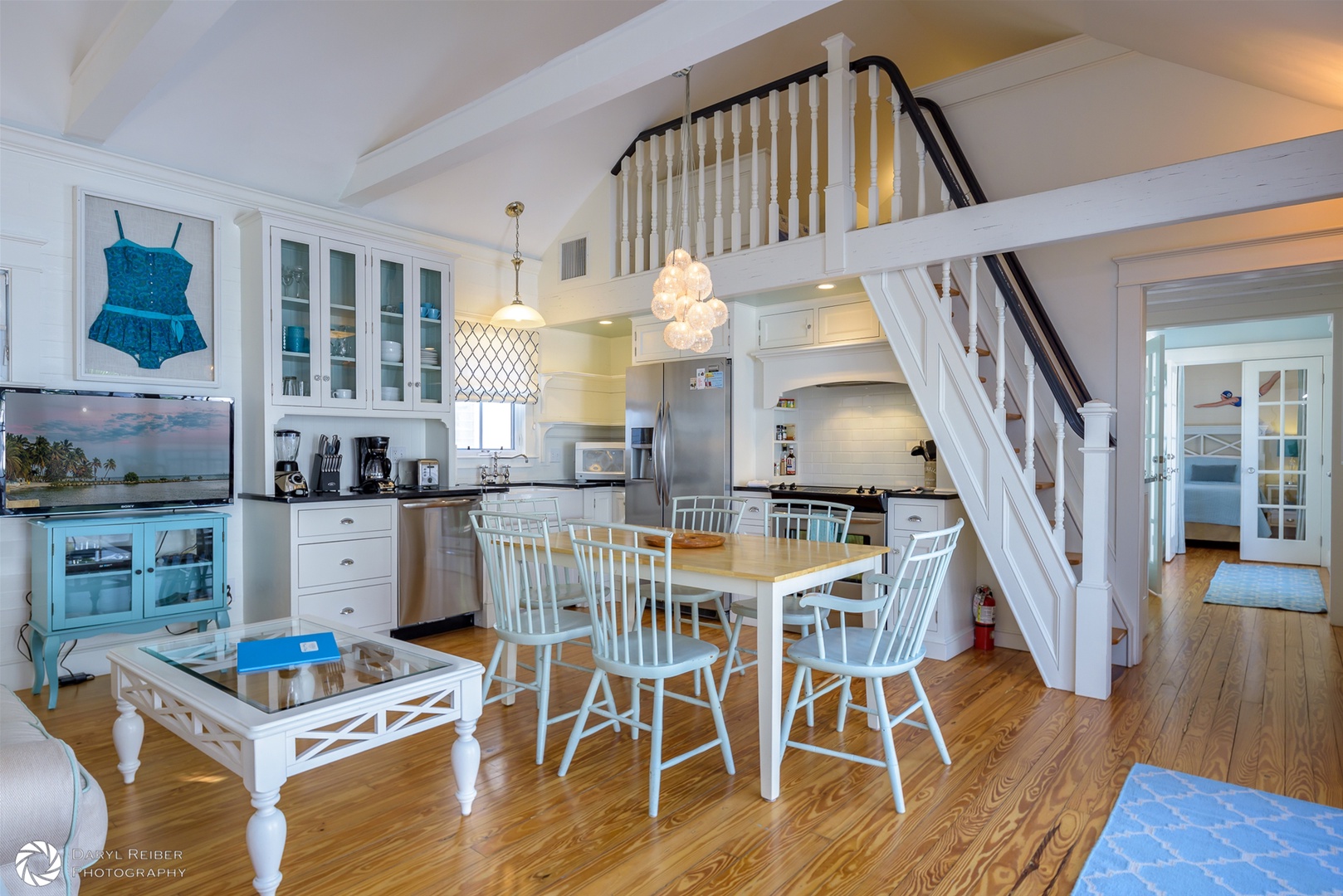 There is custom high-end wood cabinetry featured throughout the home. The kitchen has painted white maple cabinets with glass doors. The bedrooms and primary bath contain beautiful mahogany built-in cabinets, lending a Caribbean feel to the cottage. Stylish furnishings and artwork add to the tropical feel of the home, including a wonderful collection of antique swimsuits in custom shadow boxes.