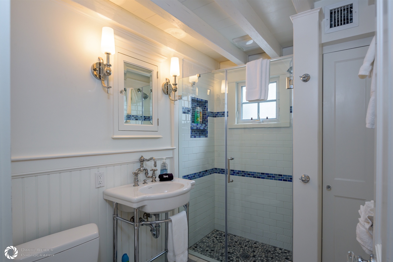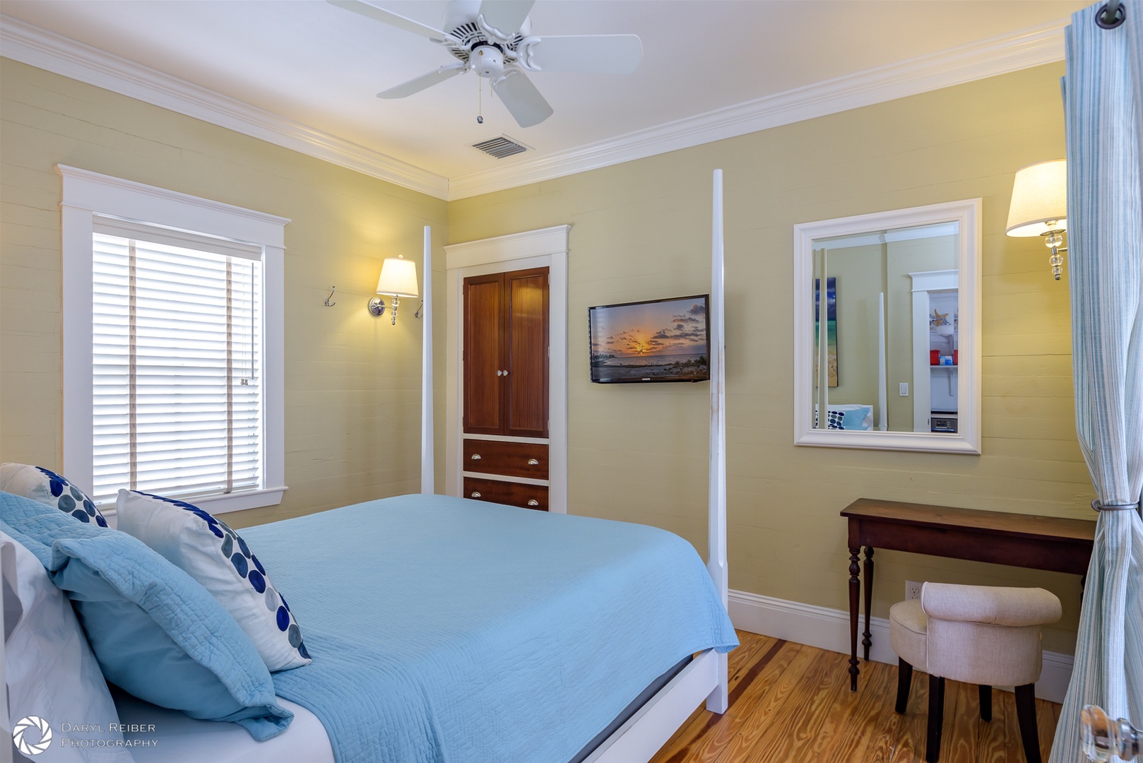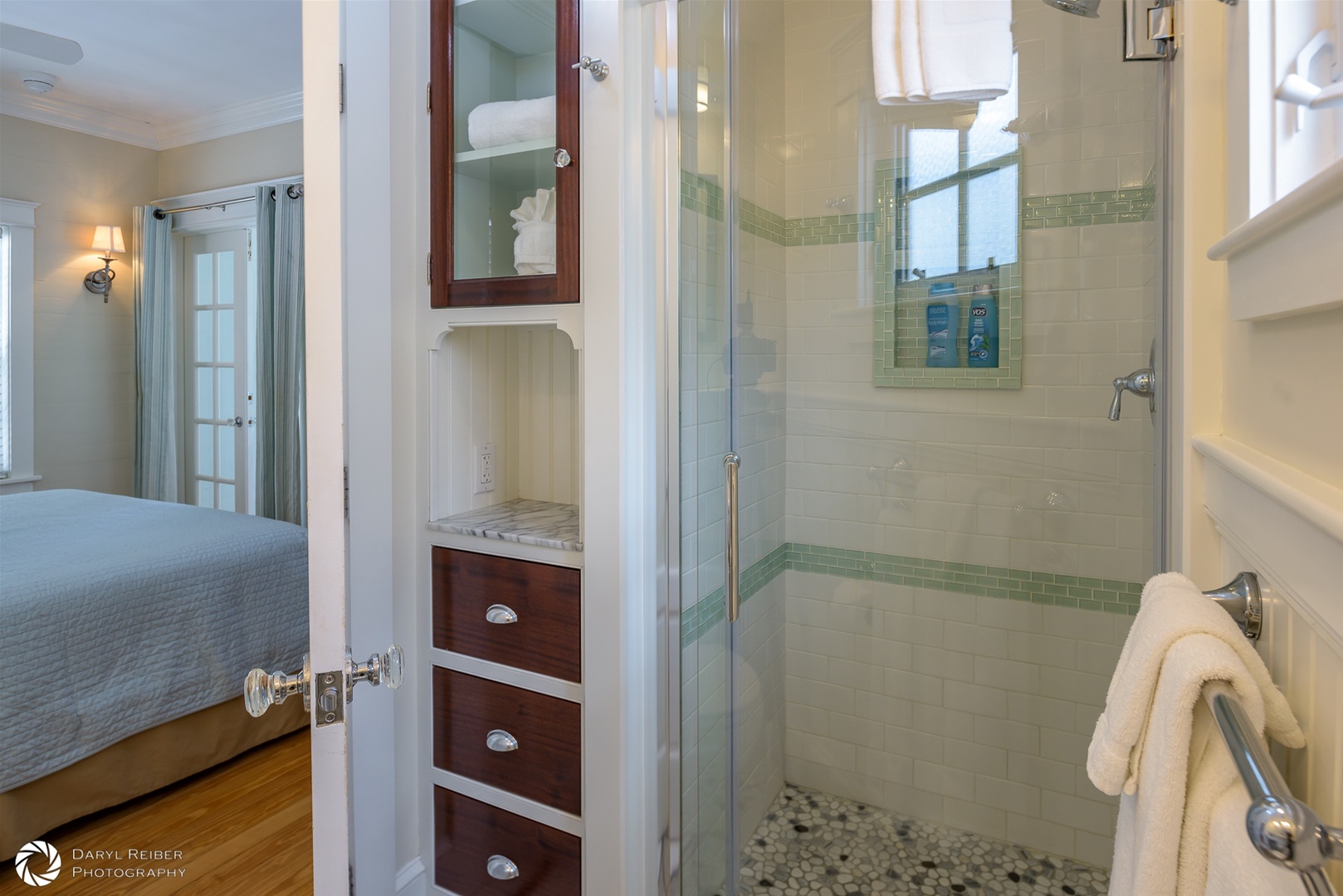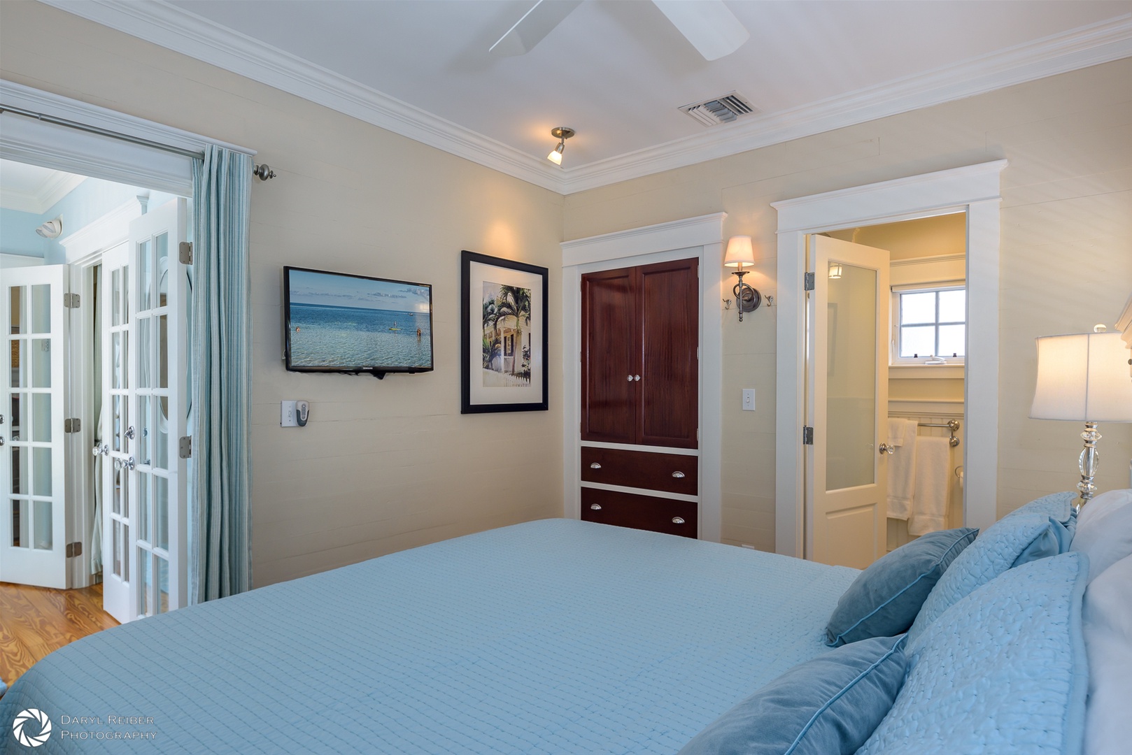 There is custom high-end wood cabinetry featured throughout the home. The kitchen has painted white maple cabinets with glass doors. The bedrooms and primary bath contain beautiful mahogany built-in cabinets, lending a Caribbean feel to the cottage. Stylish furnishings and artwork add to the tropical feel of the home, including a wonderful collection of antique swimsuits in custom shadow boxes.