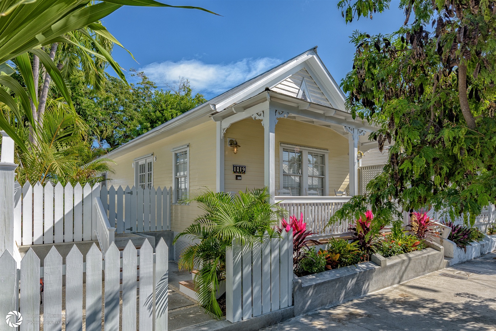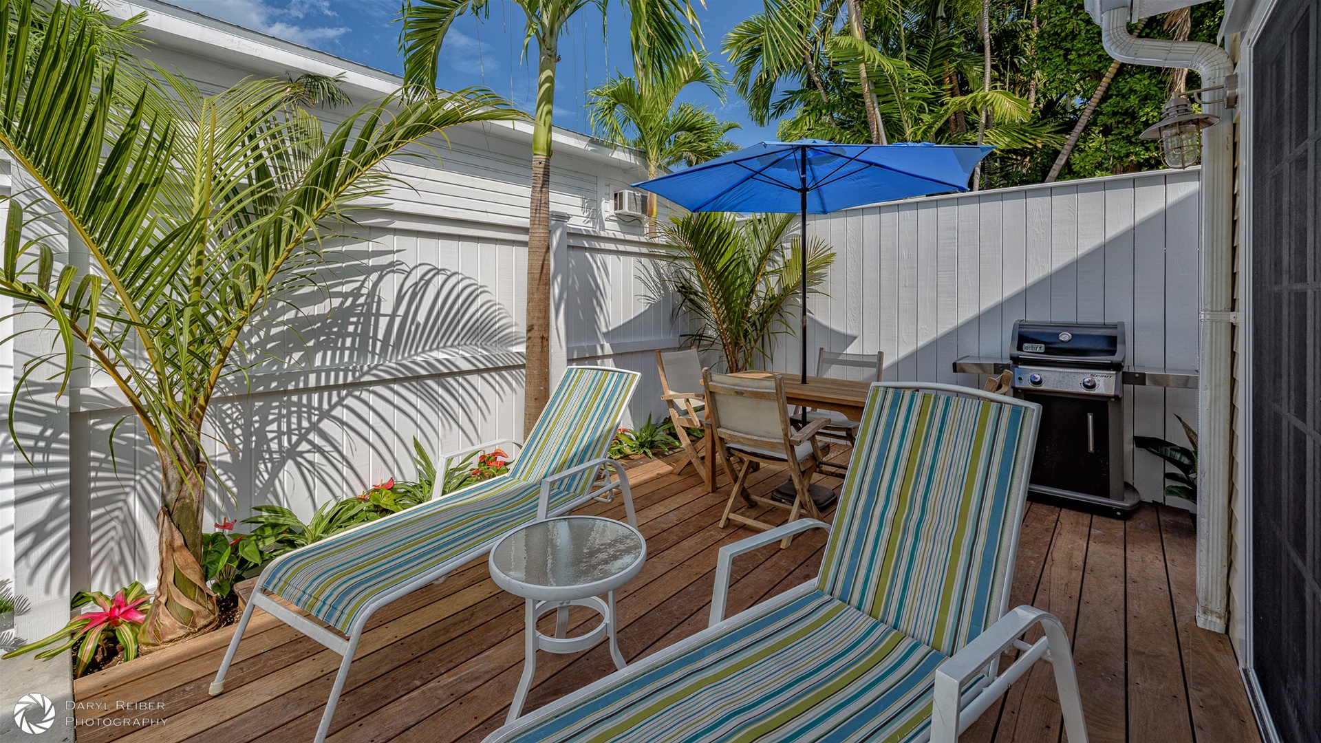 Outdoor living is perhaps the best part of Key West life. The private outdoor area is enclosed by pretty white wooden fences, and the property contains numerous tall palm trees and other tropical plantings which add to privacy and the peaceful tropical vibe of Mango Cottage.