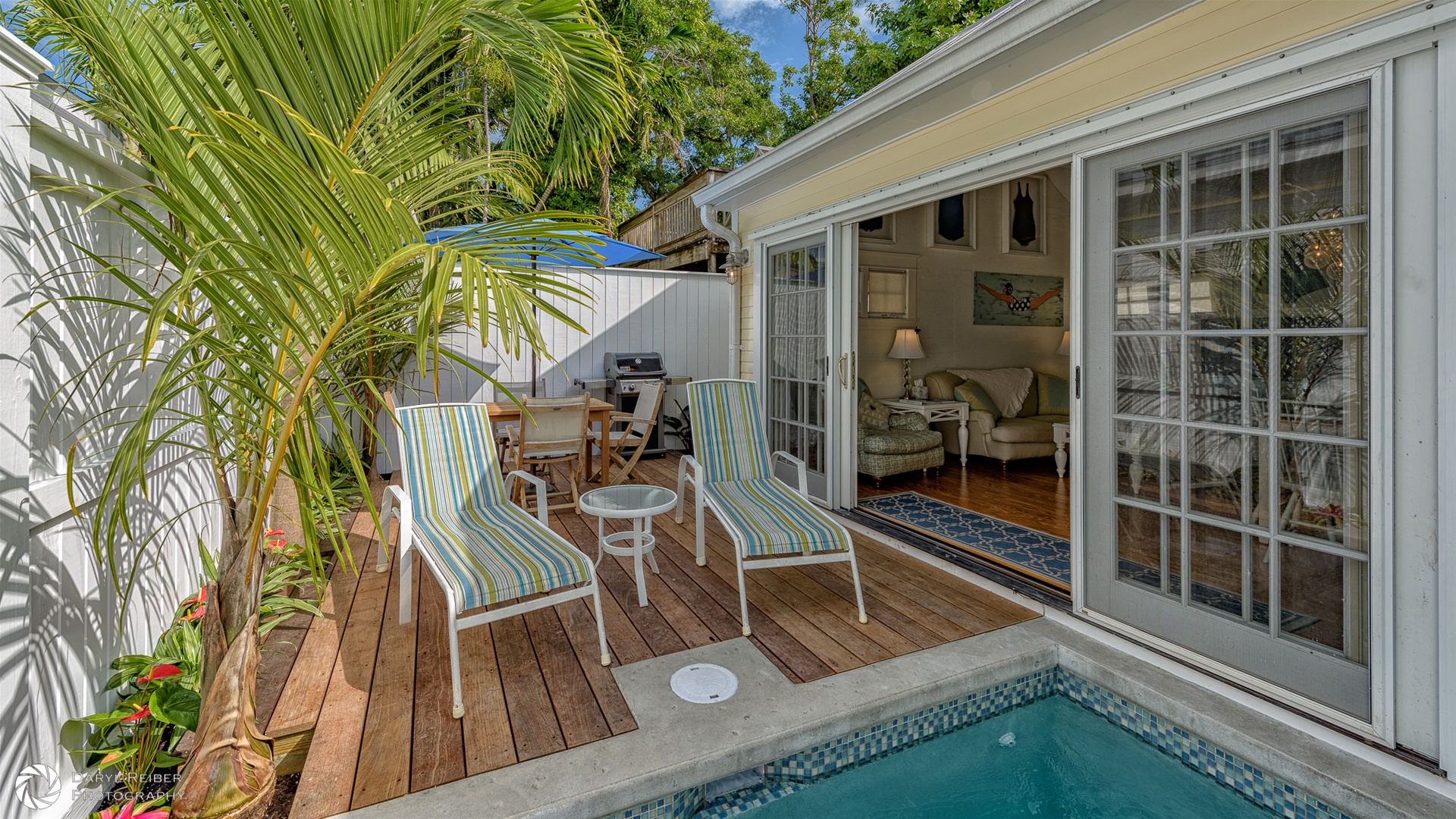 This home boasts a private heated saltwater pool which has stairs leading to the 3 foot deep shallow end, going up to 5 feet at the deepest end. There is a bench seat incorporated in the pool for lounging, and stepping stones that pass by beautiful tropical flowers along the pool’s edge. The patio offers outdoor dining for six with a teak table with sling chairs under the shade of a 9 foot cantilever umbrella, as well as two comfortable lounge chairs nestled between palm trees for working on your Key West tan.
