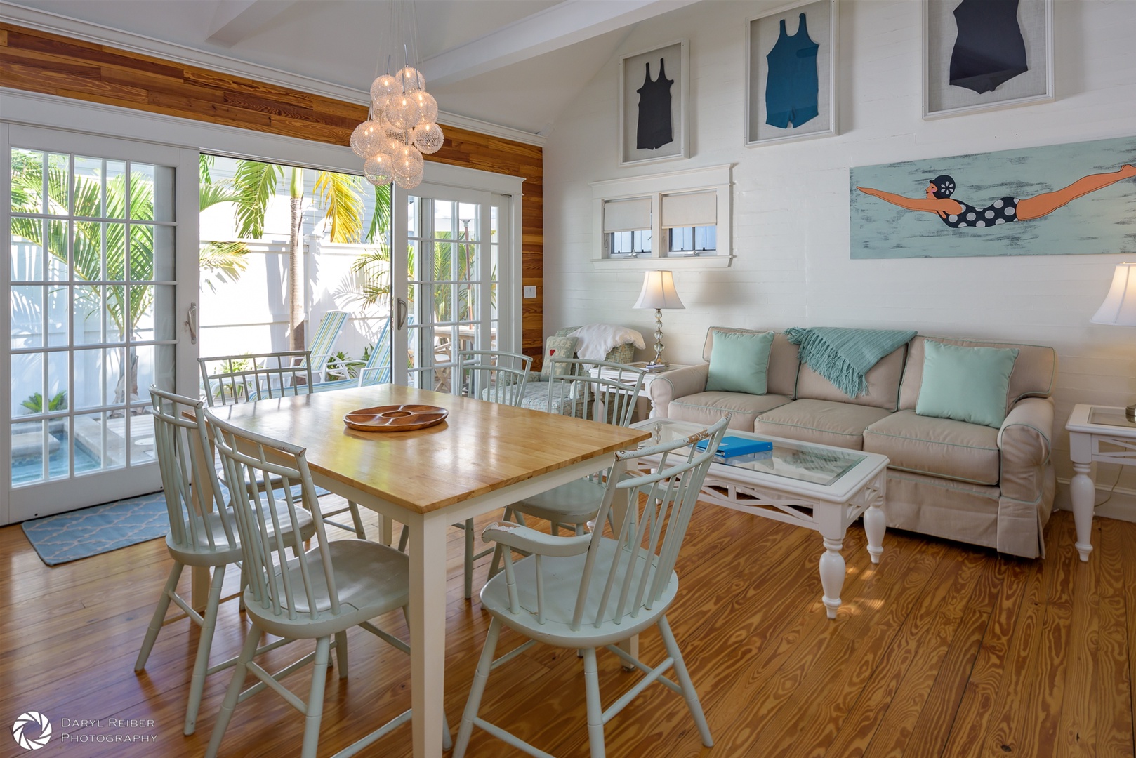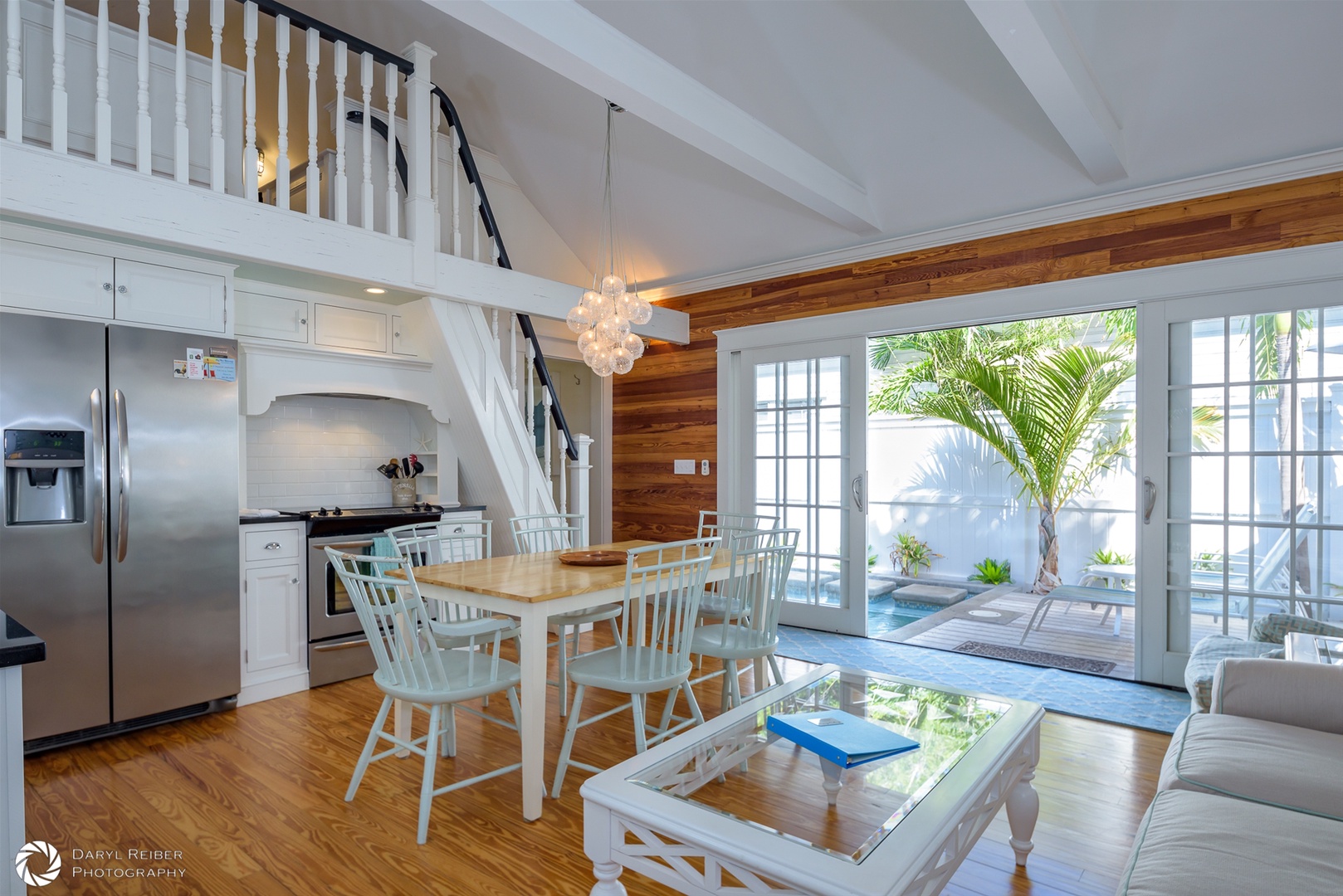 Mango Cottage has antique Dade County pine walls and floors throughout the cottage. The open-concept kitchen, living room, and dining area have fantastic 12 foot sliding glass doors, which create abundant natural light under a high vaulted ceiling and provide seamless indoor/outdoor living. The beautiful salt water heated pool and deck area make it the perfect place to enjoy your Key West vacation. The kitchen offers stainless appliances and granite countertops with a large white enameled farmers sink, garbage disposal, dishwasher, microwave, full oven/stove, and a side-by-side refrigerator/freezer with crushed ice and water through the door. There is a commercial grade