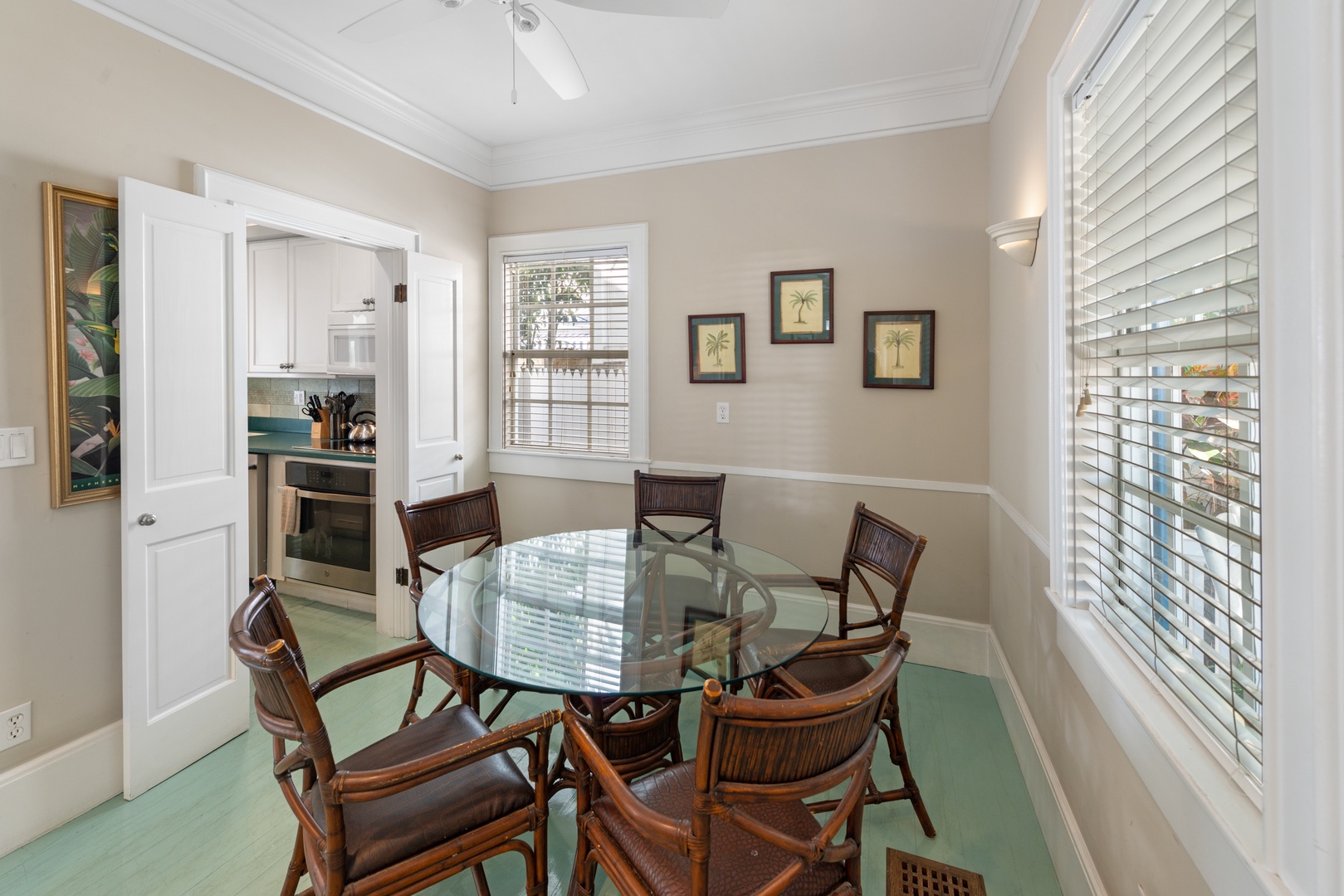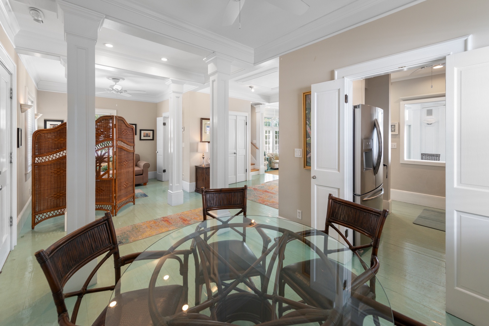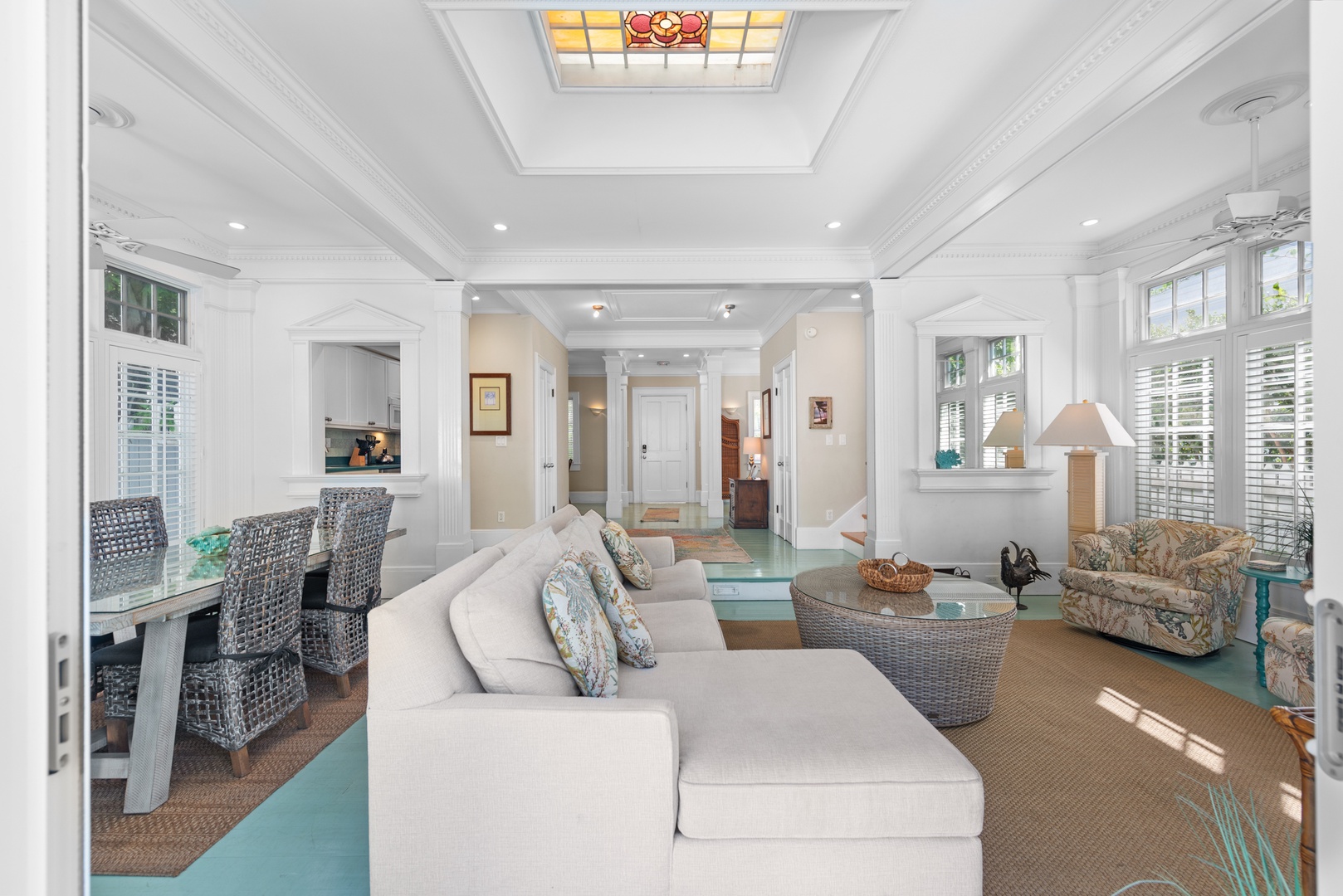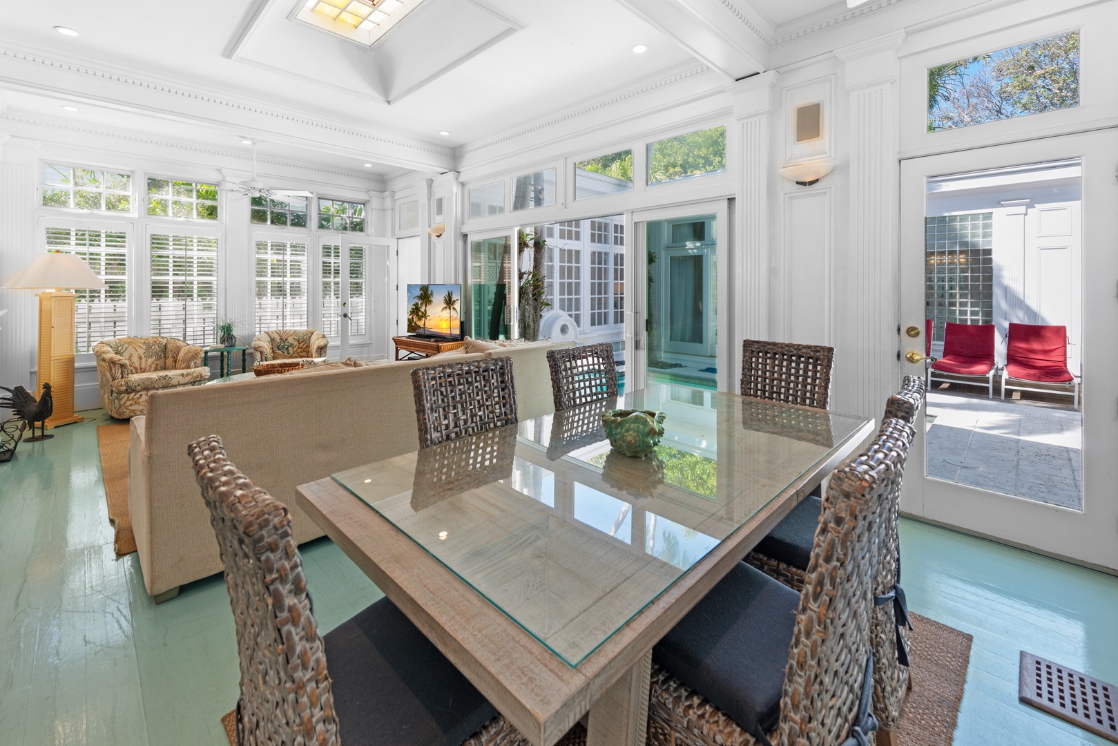 Light pours through the 10-foot glass doors into the expansive, luxurious Great Room that is surrounded by the lush tropical garden. Hardwood floors throughout the home blend beautifully with the elegantly appointed high-end furnishings. Enjoy the six-person formal dining suite just steps away from the stylish living room, complete with a flat-screen TV, DVD player, and stereo system. You will appreciate the distinct details, including a backlit stained glass mural in the ceiling, which adds the perfect ambiance to this romantic space.