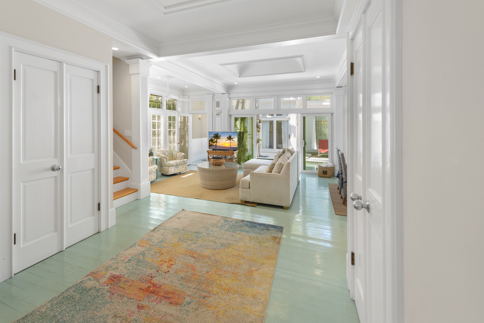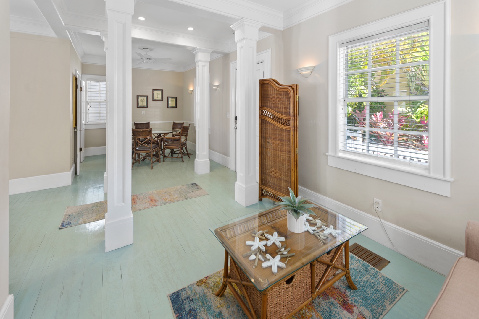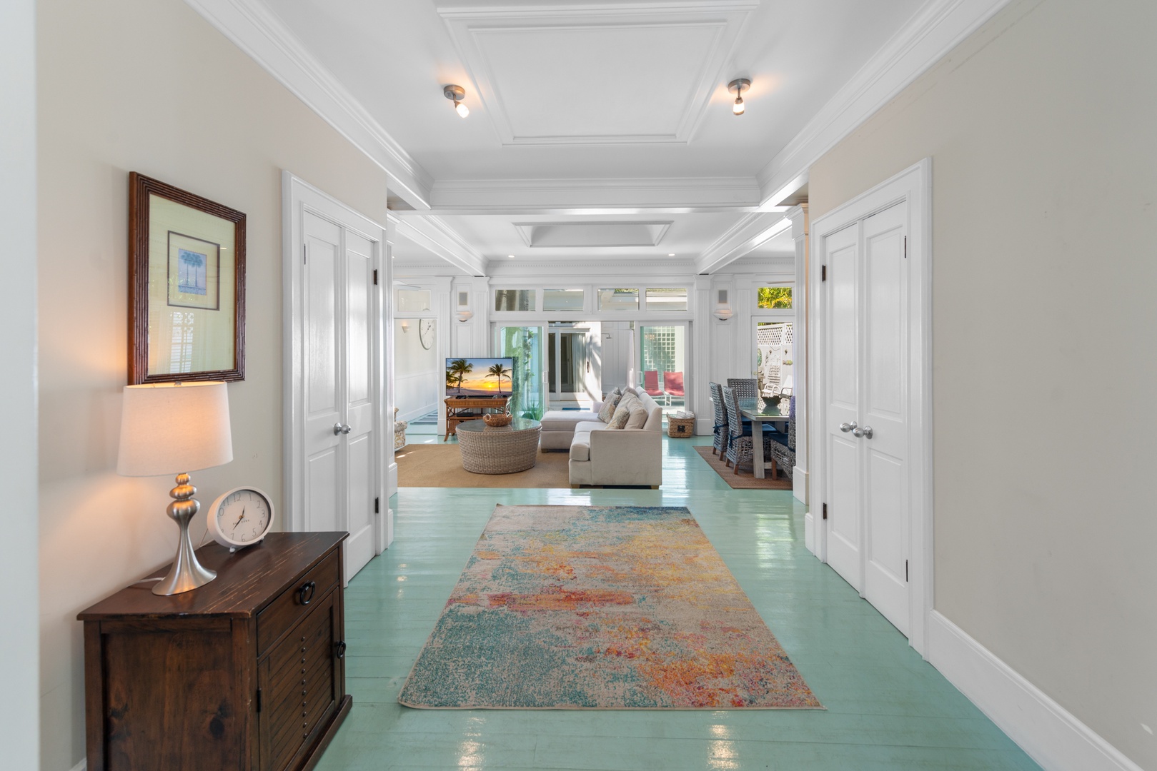 Light pours through the 10-foot glass doors into the expansive, luxurious Great Room that is surrounded by the lush tropical garden. Hardwood floors throughout the home blend beautifully with the elegantly appointed high-end furnishings. Enjoy the six-person formal dining suite just steps away from the stylish living room, complete with a flat-screen TV, DVD player, and stereo system. You will appreciate the distinct details, including a backlit stained glass mural in the ceiling, which adds the perfect ambiance to this romantic space.