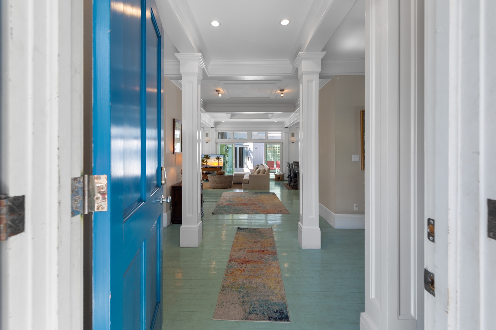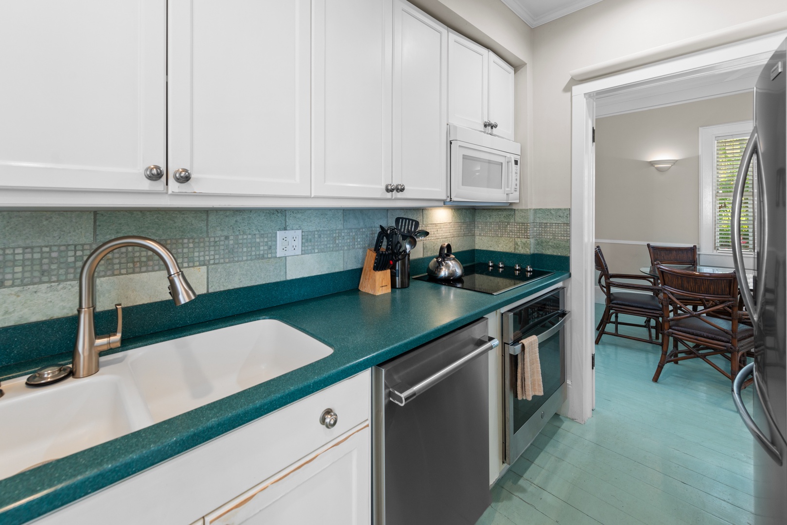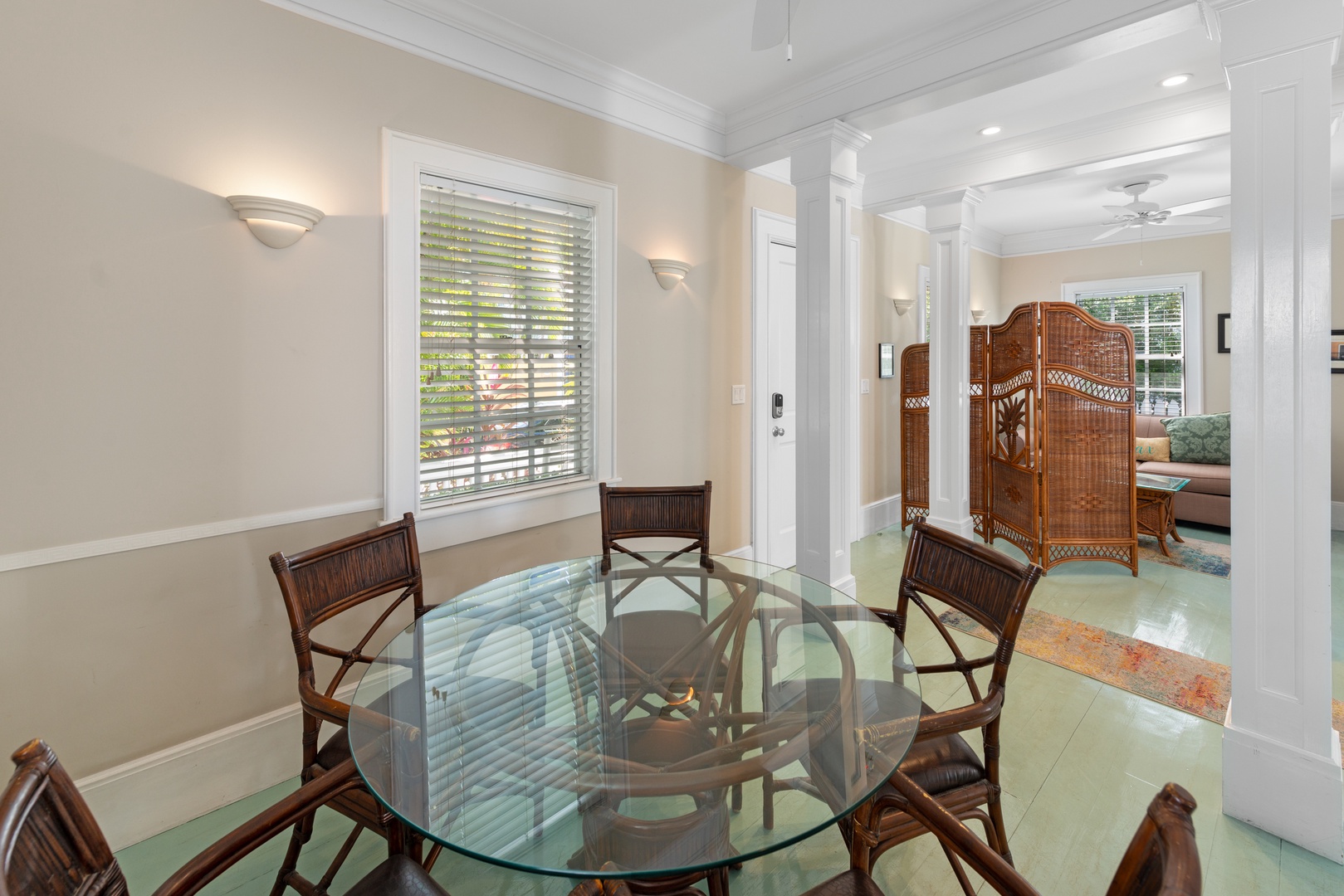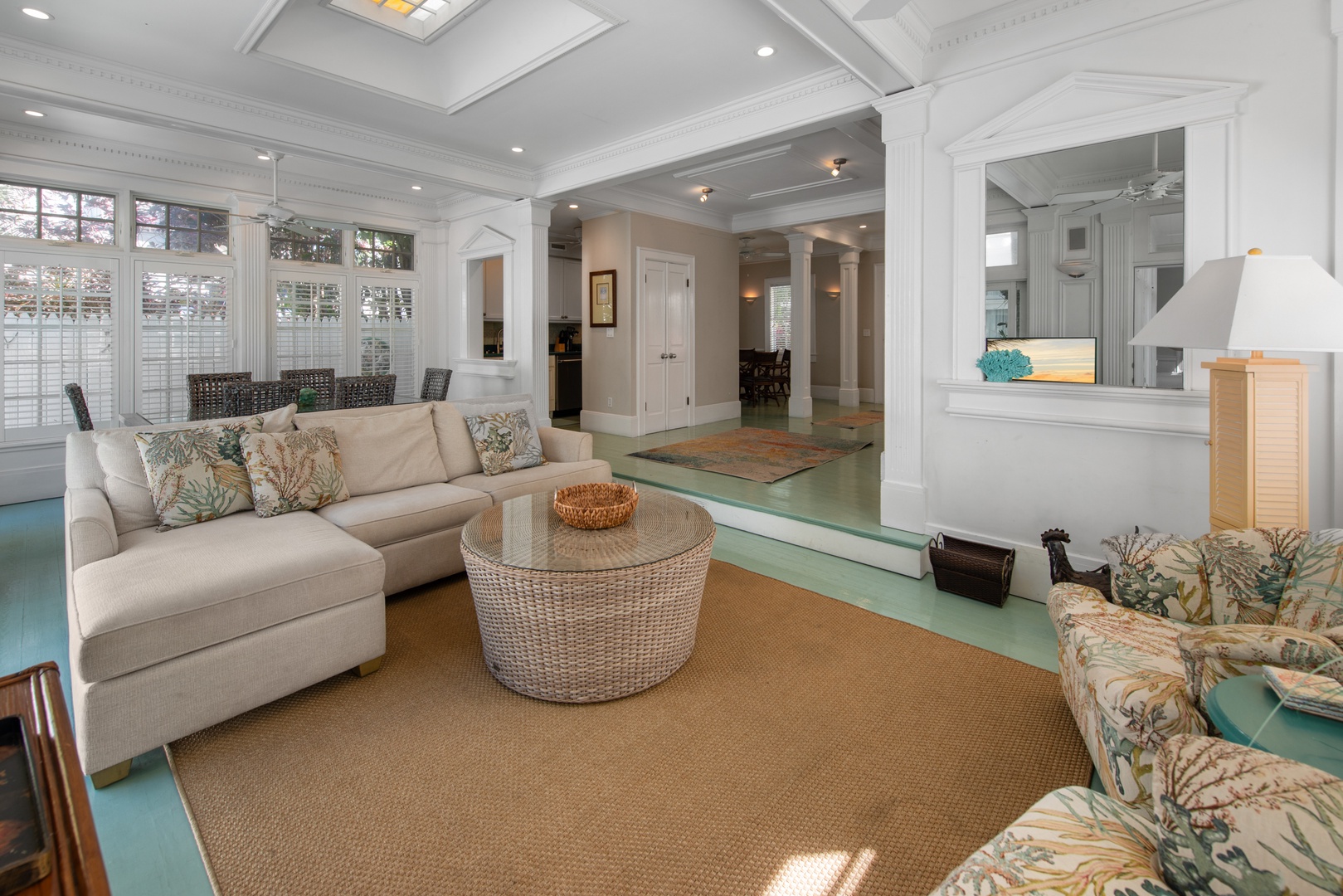 Light pours through the 10-foot glass doors into the expansive, luxurious Great Room that is surrounded by the lush tropical garden. Hardwood floors throughout the home blend beautifully with the elegantly appointed high-end furnishings. Enjoy the six-person formal dining suite just steps away from the stylish living room, complete with a flat-screen TV, DVD player, and stereo system. You will appreciate the distinct details, including a backlit stained glass mural in the ceiling, which adds the perfect ambiance to this romantic space.