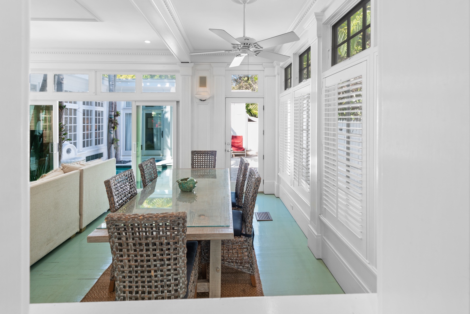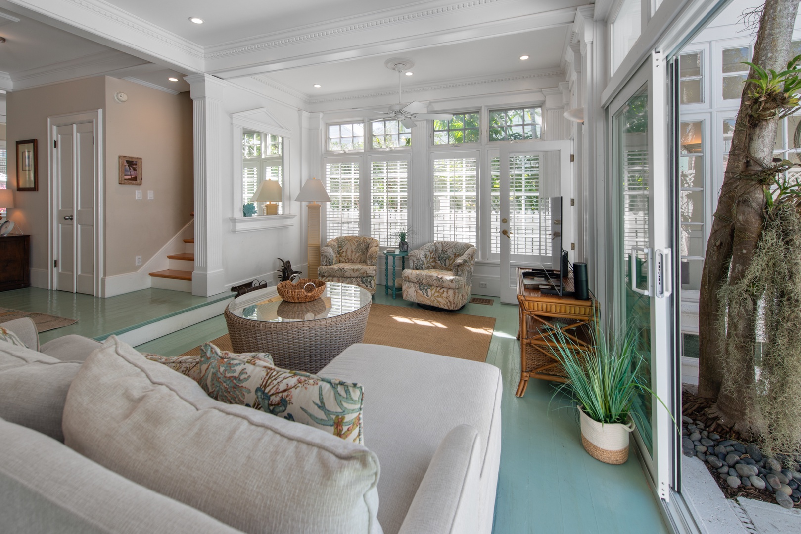 Across from the pool area in its own private wing of the house is an airy, spacious, private primary bedroom with French doors that open up to the pool/garden area. This room features a high-quality Serta king bed with down duvet, TV and DVD player, ceiling fan, and an intimate bath with a marble shower. This large primary bath with a stunning glass block wall also features a full-size Maytag stacked washer/dryer for your convenience. Upstairs in the main house are two bedrooms: one with a king bed and TV; and the other with a queen bed and TV/DVD. A tropically-infused large common area shared by the two bedrooms has cozy seating with a sofa and chairs, as well as a beautifully detailed full bath. Casa Loca is outfitted with the finest luxury linens, down comforters, and thick beach and bath towels. An iron and ironing board, central A/C, and additional room A/C units complete this exclusive, one-of-a-kind estate in the heart of Old Town Key West!