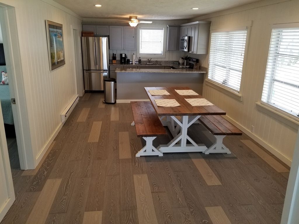 Solid white oak floor throughout welcome you! A complete renovation including new kitchen with granite counters and stainless steel appliances. New bathroom vanity upstairs and down, new blinds and a fresh coat of paint make this vacation property feel brand new. Also expanded ground floor living/bed room with interior access via the spiral staircase in the living room