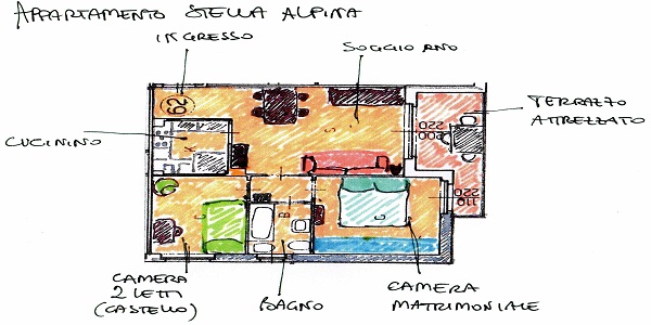 Edelweiss apartment is located on the third floor of the building " CAMARTA 3", this flat is made up of entrance hall , living room with sofa bed, kitchen, double bedroom, bedroom with bunk bed , bathroom with bath / shower and a large terrace with view on the surrounding mountains. The apartment is a perfect solution for 6 people. Lift, fully equipped kitchen, living room with dining table for 6 people, a flat-screen TV, washing machine, bed linen, towels, hair dryer, iron, balcony, electricity, water and gas. Parking for cars and large parking in front of the house. The apartment has a large storeroom in the basement for sports equipment.
