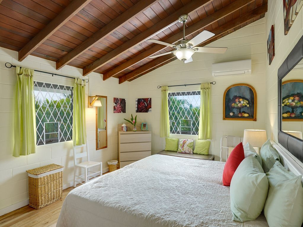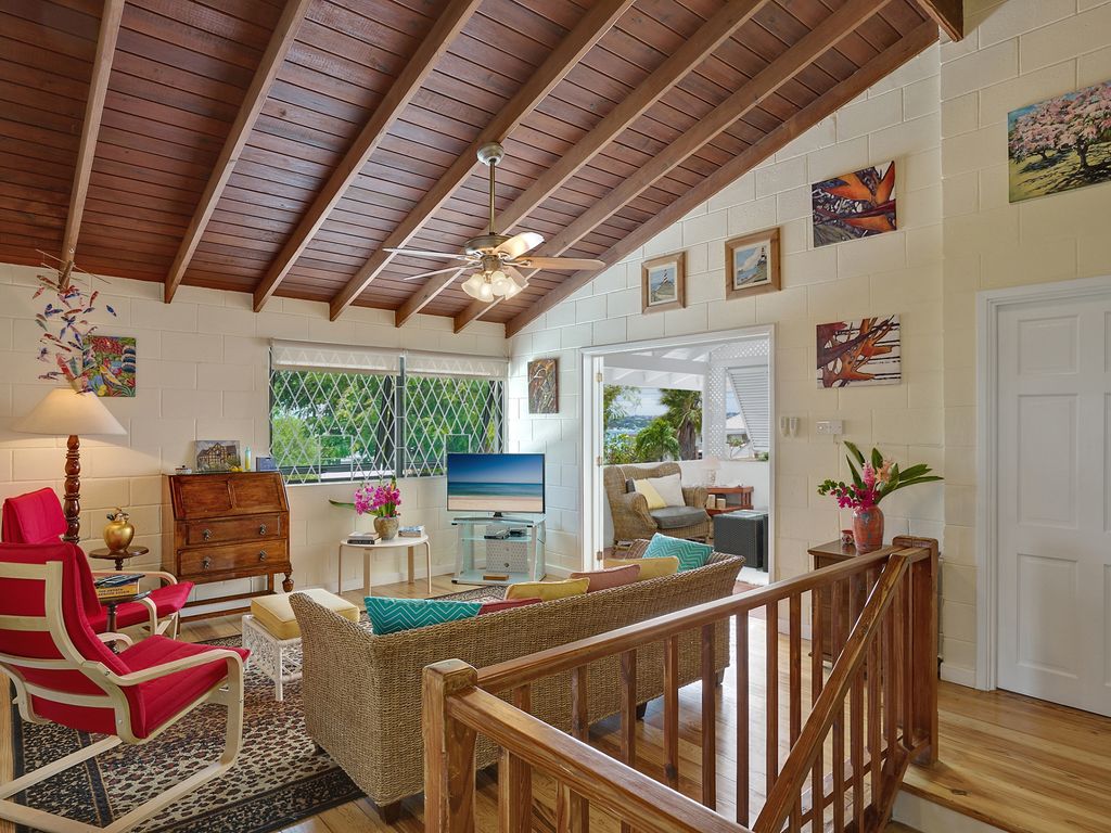 Double doors lead on to spacious terraces on both floors; enjoy morning coffee on the upstairs patio with its sea views, and later in the day the shaded area of the verandah and pool deck are ideal for enjoying the sea breezes while watching hummingbirds flit about the vibrantly coloured bougainvillea and hibiscus in the private garden; or you can get some sun-kissed R&R lounging by the pool with a good book and a cool drink.