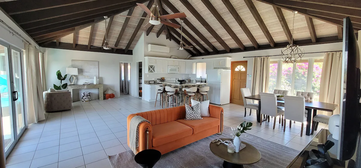 The living room features sliding glass doors that open out onto the pool terrace with ocean views. The pool terrace is comfortably appointed with sun loungers, dining table with seating for 6 and outdoor bar for your enjoyment. Perfect for entertaining and sharing meals with friends and family. The large master bedroom and private ensuite bath also opens on to the pool terrace as well.