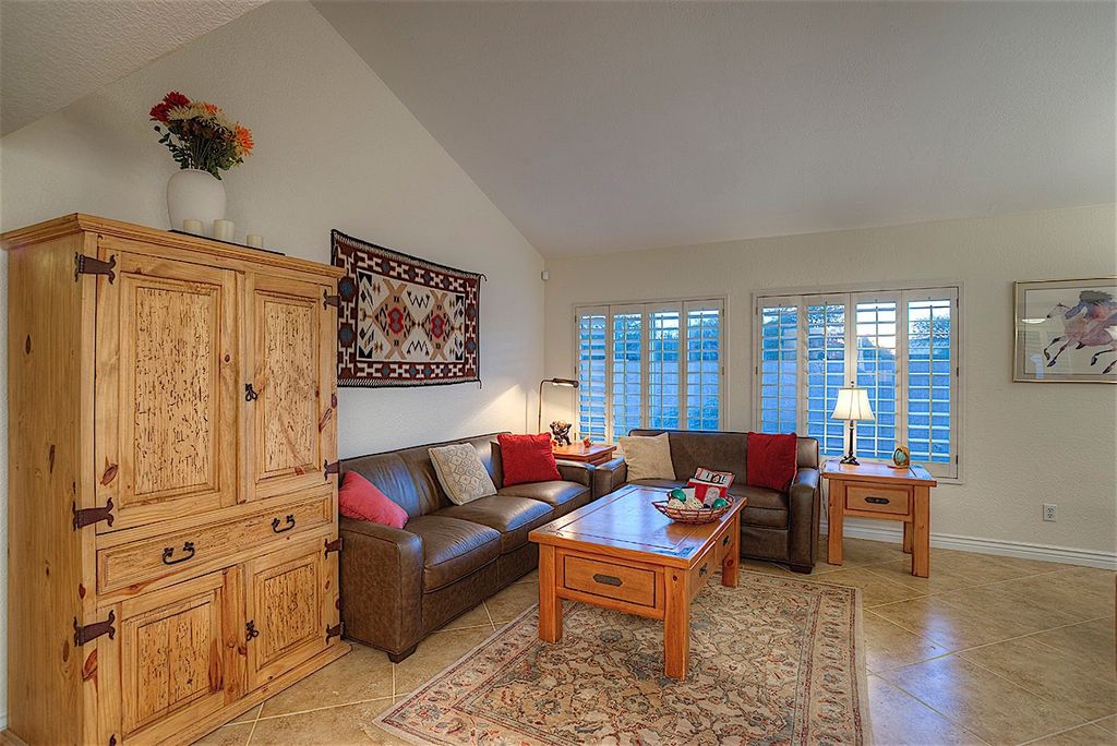 The patio home has 3 bedrooms and 2 bathrooms. The living room is tile floors, tall vaulted ceilings, a leather couch and leather love seat, flat screen TV with DVD and a stereo with Bose Speakers. The kitchen has granite counters, tile floors, and stainless steel appliances. The dining area has a wood table with seating for six. The back patio has a table with umbrella and seating for six, plus two more adjacent lounge chairs.